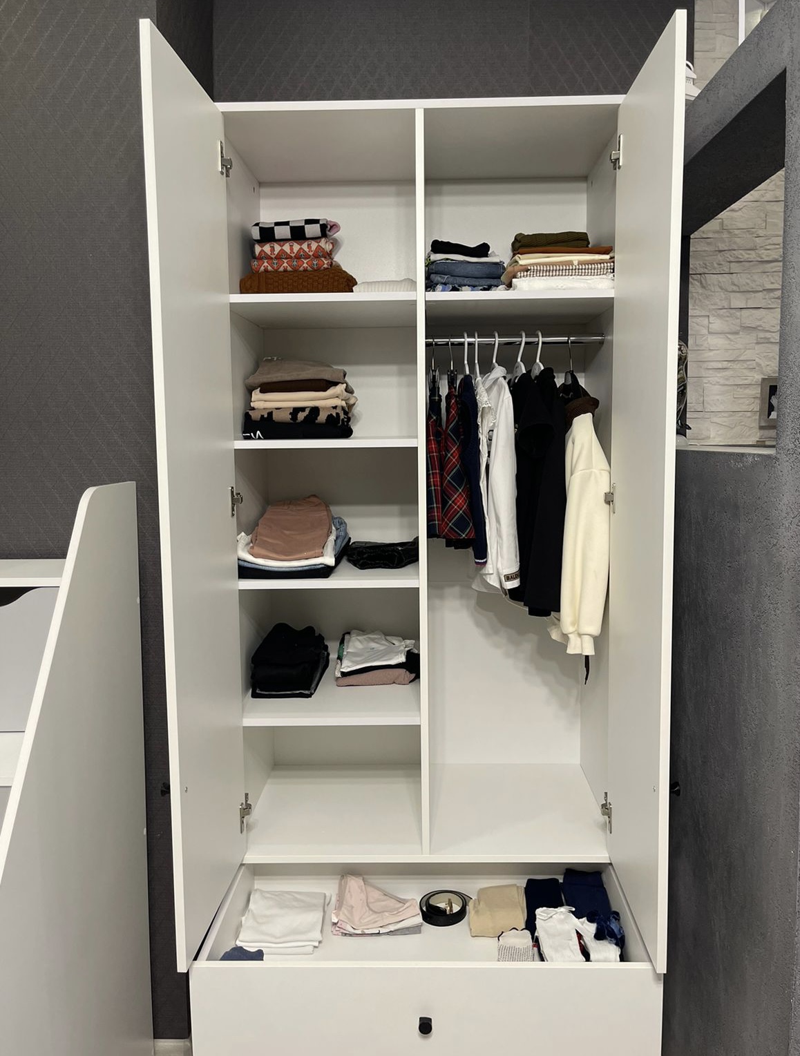 Шкаф поможет максимально грамотно использовать пространство, ведь у него есть два ящика для мелких вещей, штанга, верхние и боковые полки.