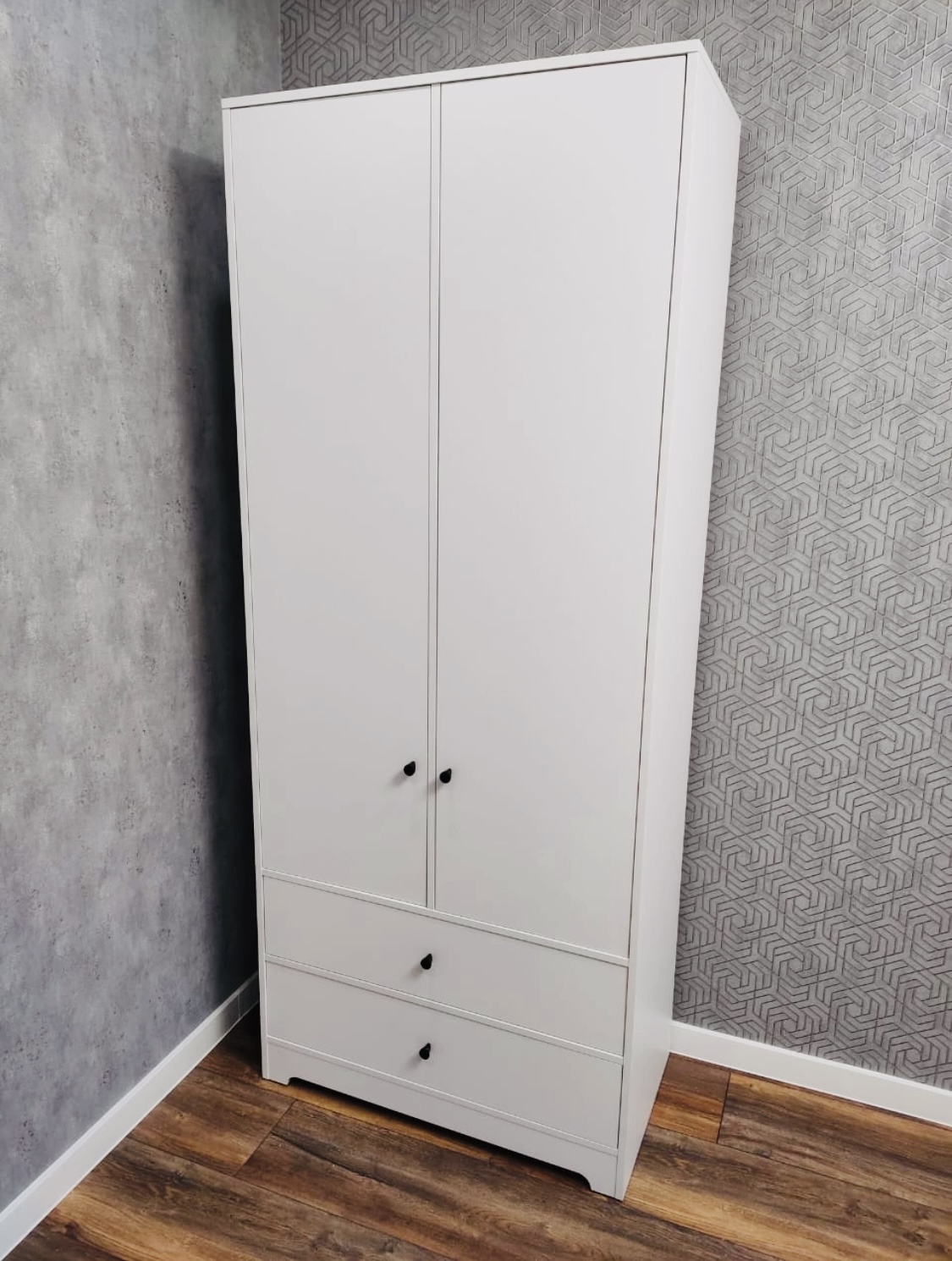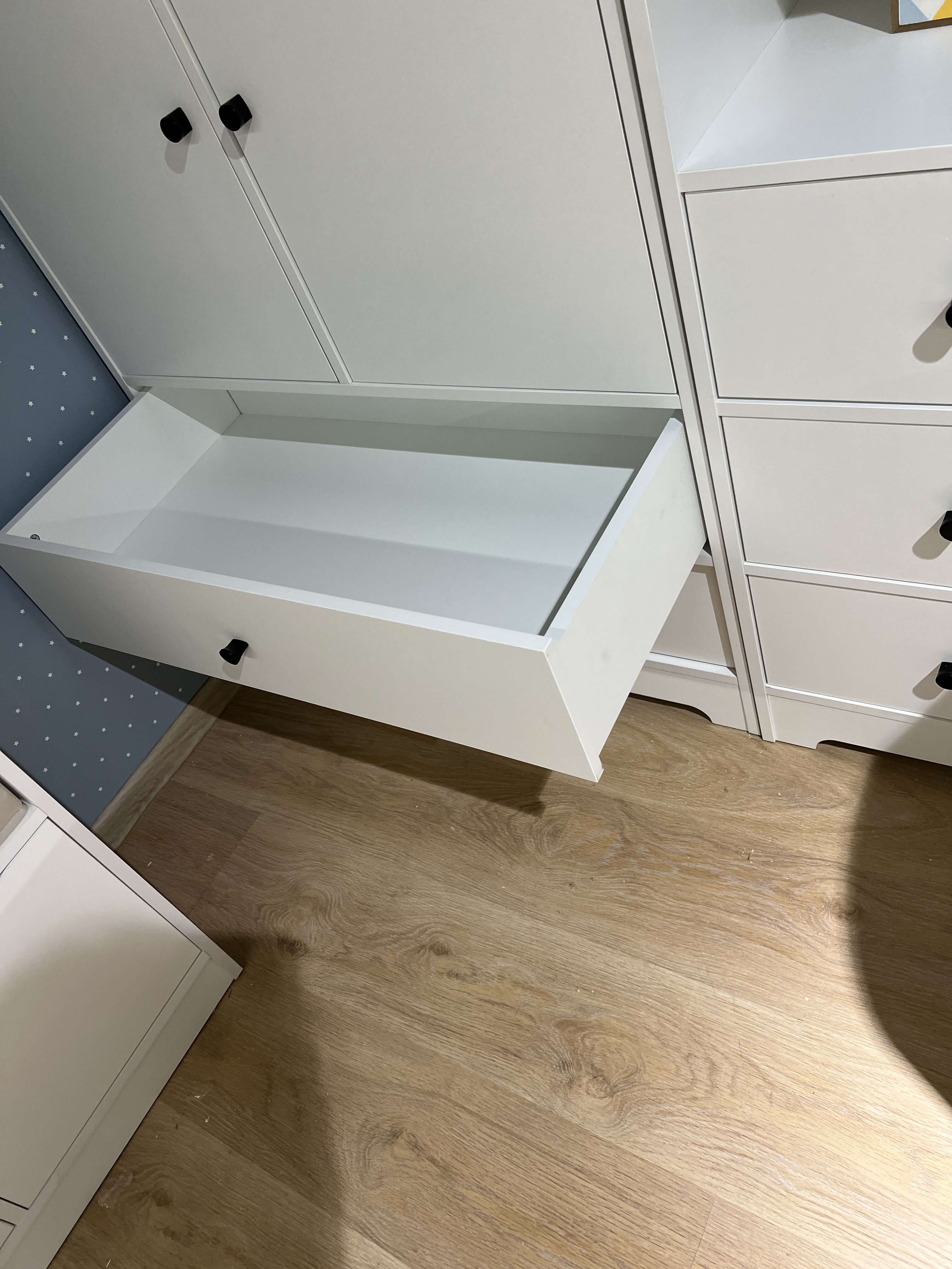 * В шкаф встроены два выдвижных ящика на направляющих скрытого монтажа с доводчиками.