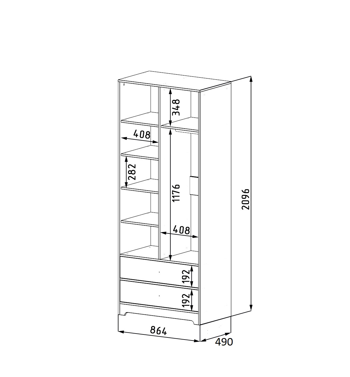 Габариты шкафа: ширина 864, глубина 490, высота 2096 мм