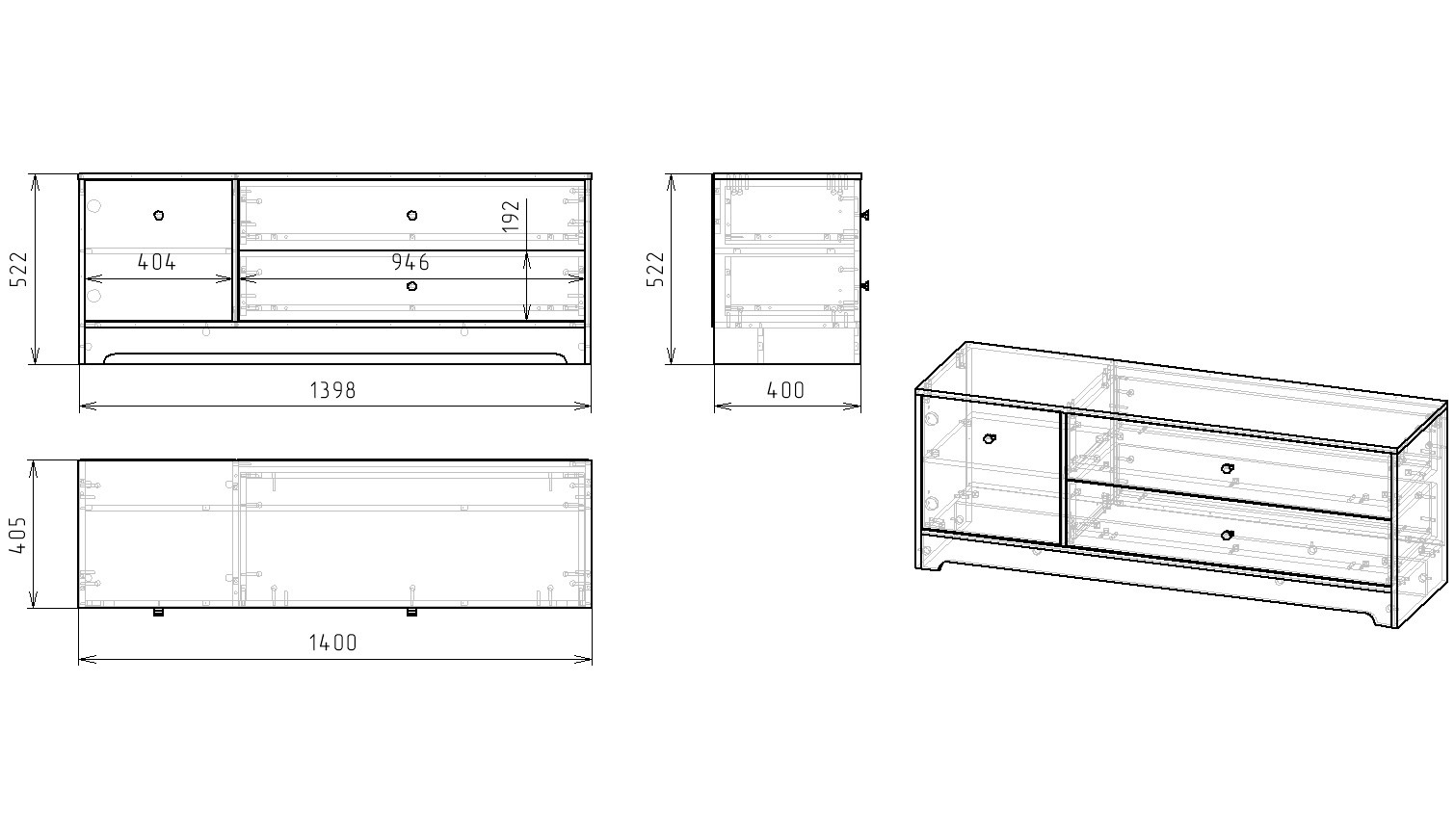 Габариты тумбы: ширина 1400, глубина 405, высота 522 мм