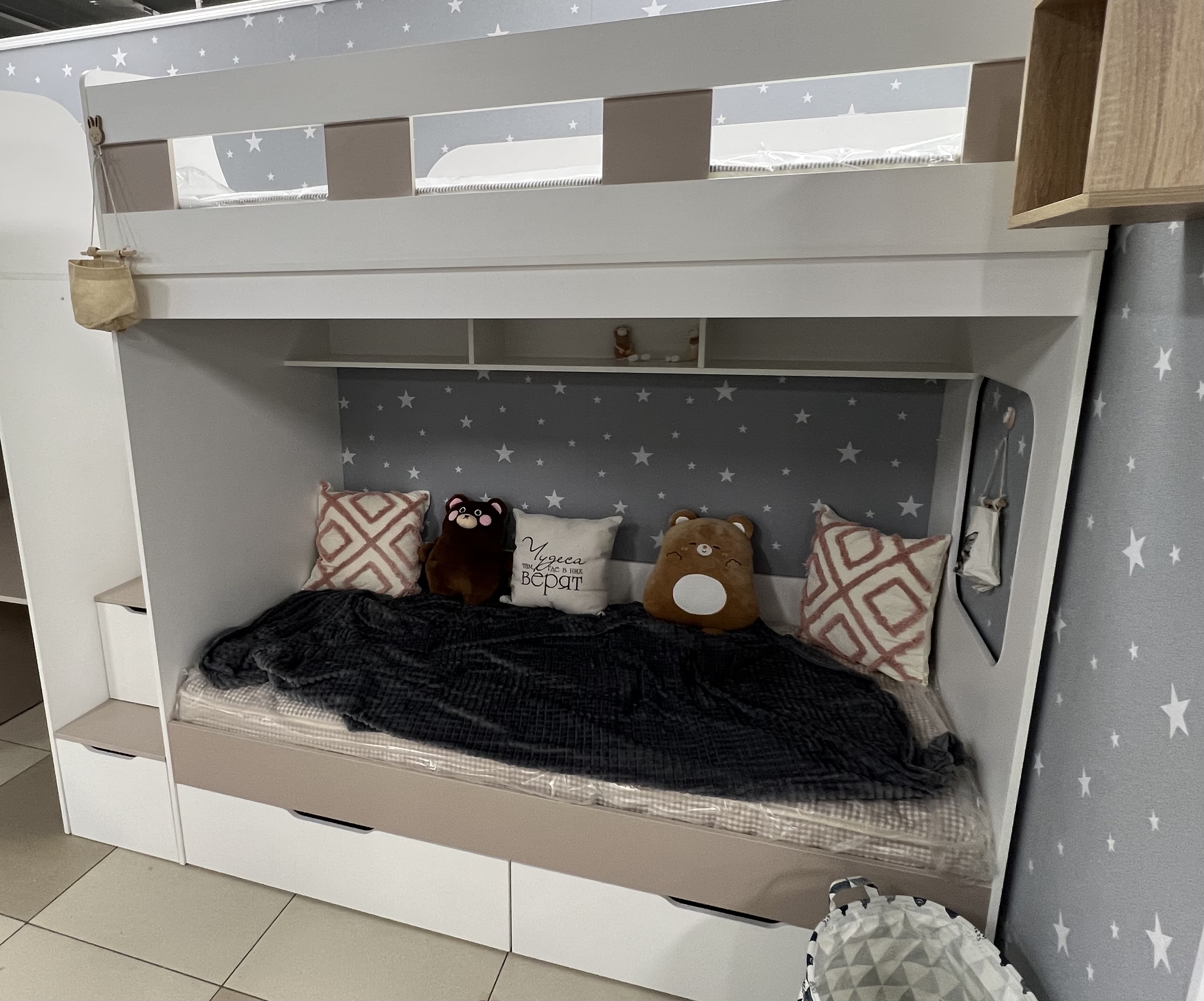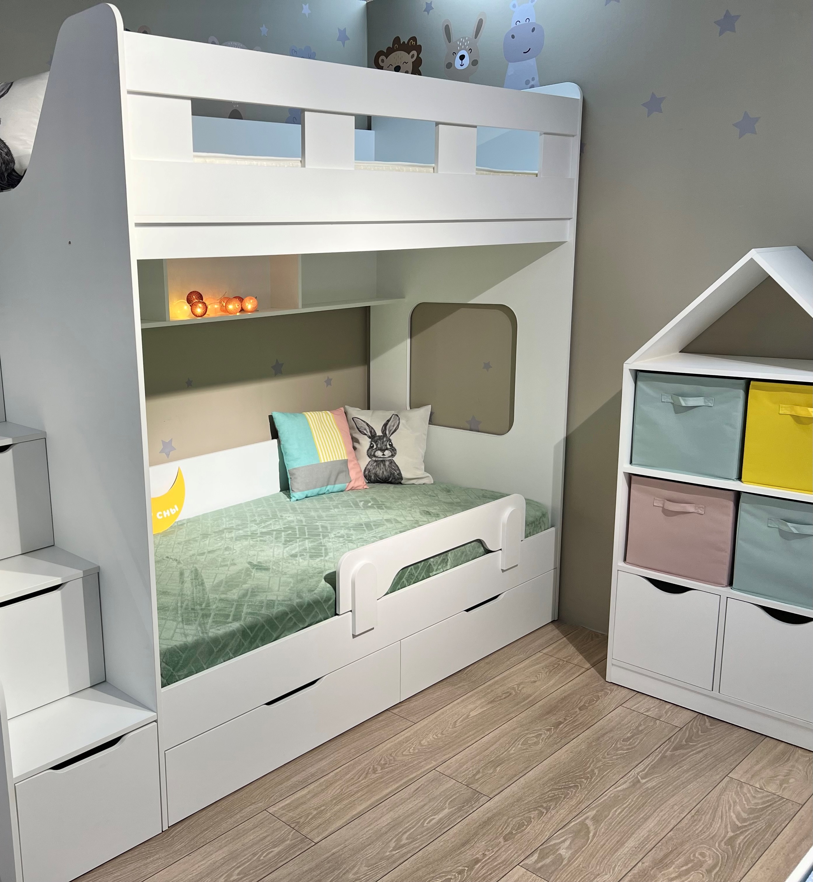 Высокая нагрузка на спальные места. Удобная лестница-комод. Высокие, безопасные бортики