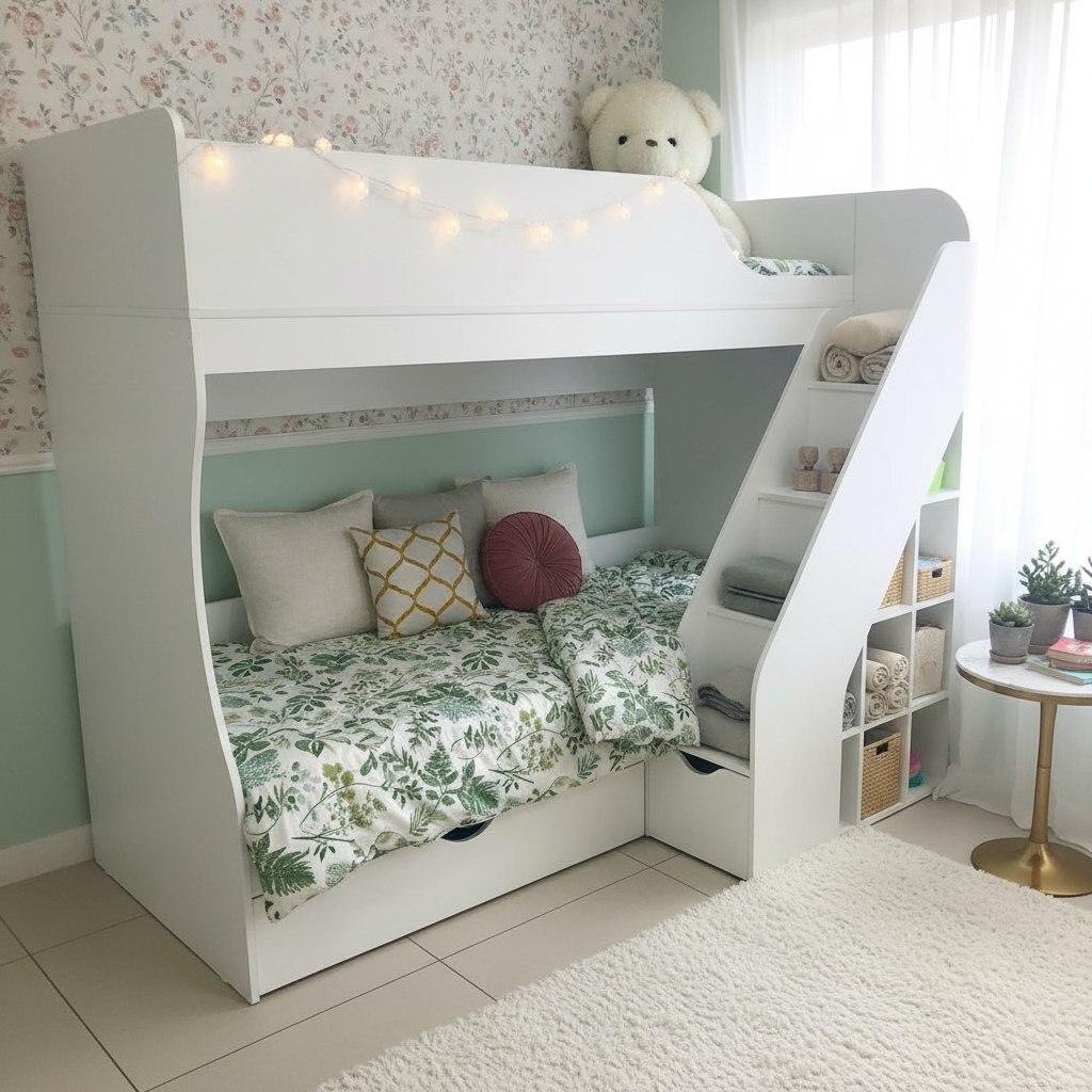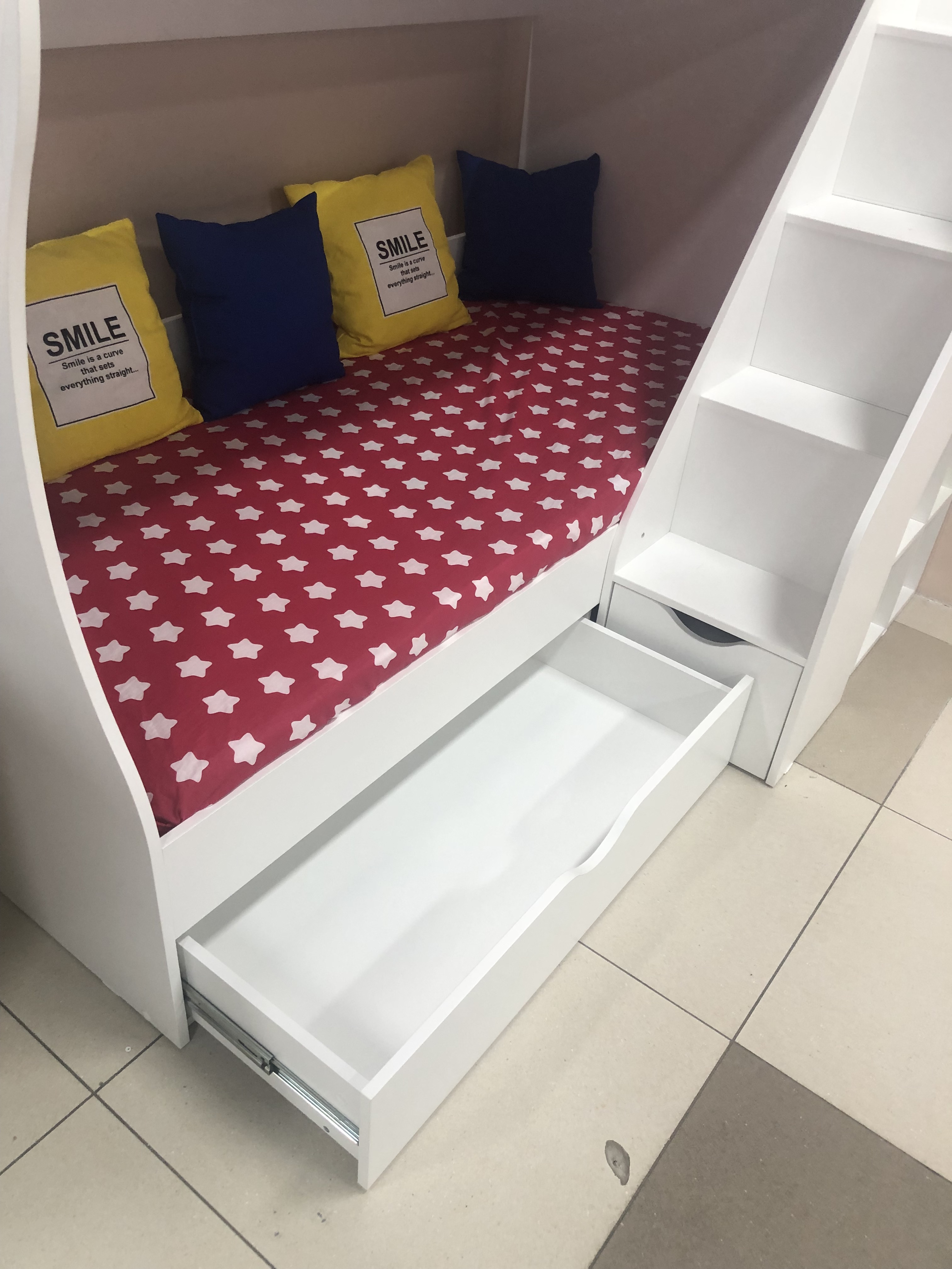 Удобная, безопасная лестница со встроенными полочками для книг и игрушек и комфортная высота кровати.