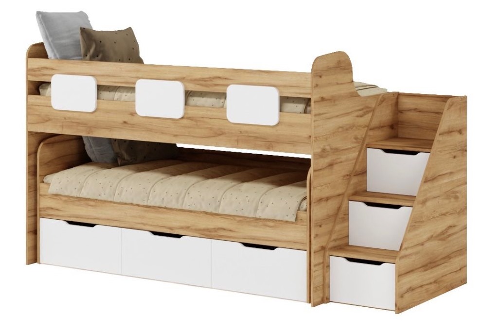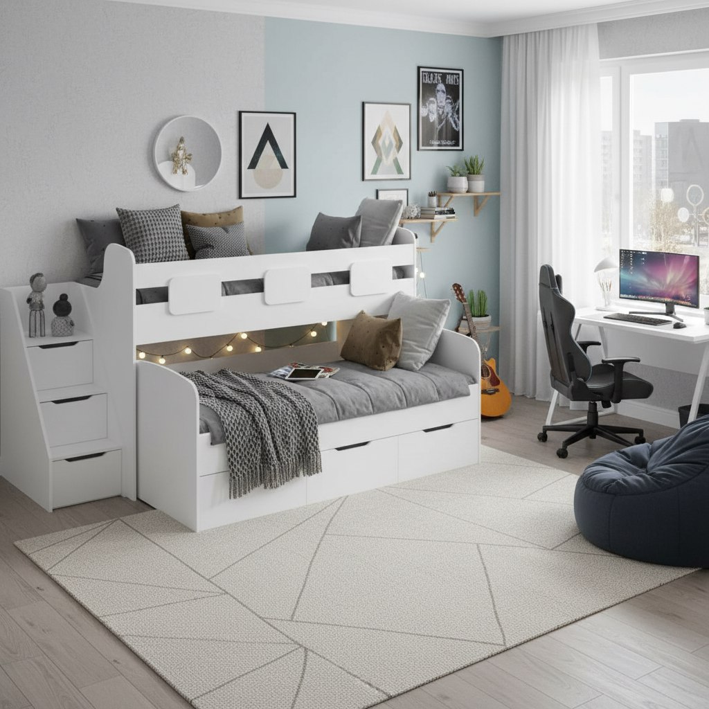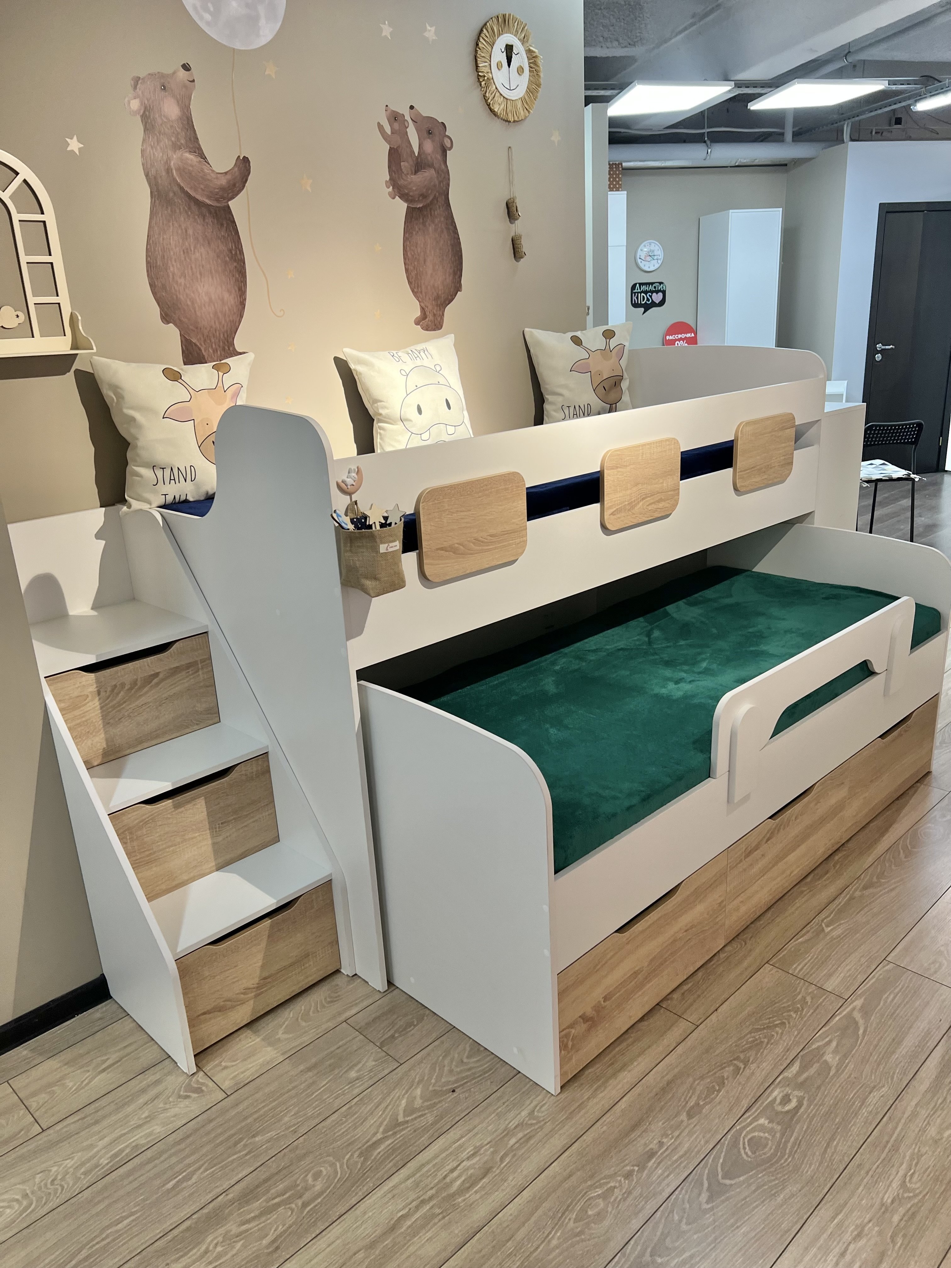 - Невысокая конструкция кровати обеспечивает удобный доступ на второй этаж, делая её идеальной даже для самых маленьких детей.