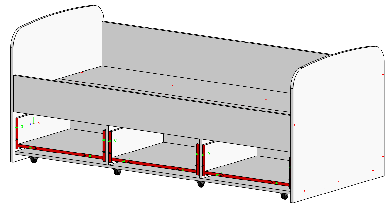 Кровать имеет три выдвижных ящика для хранения белья и игрушек (ящики на шариковых направляющих скрытого монтажа с доводчиками).