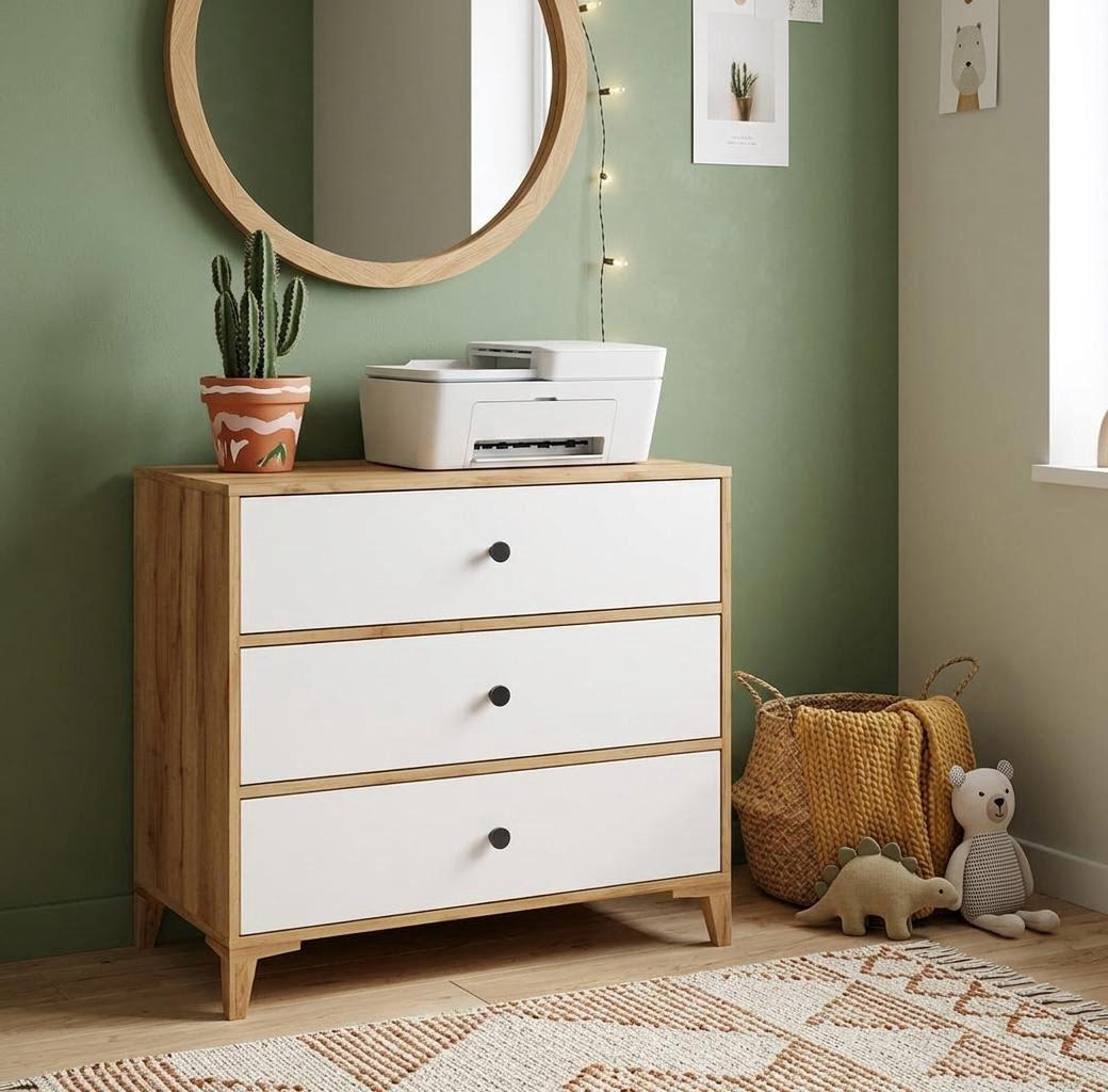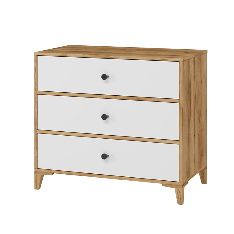 В комод встроены три выдвижных ящика на направляющих скрытого монтажа с доводчиками.