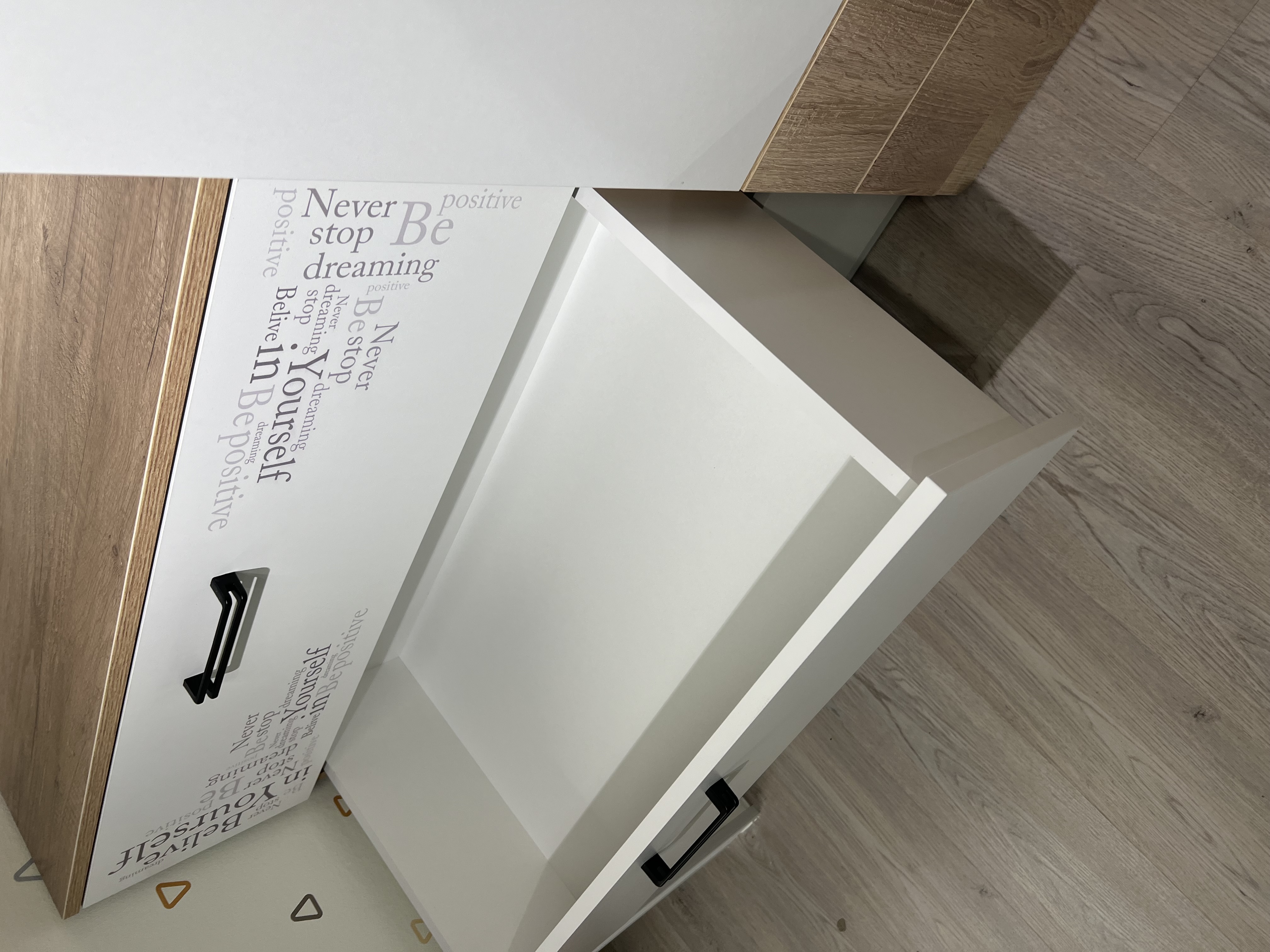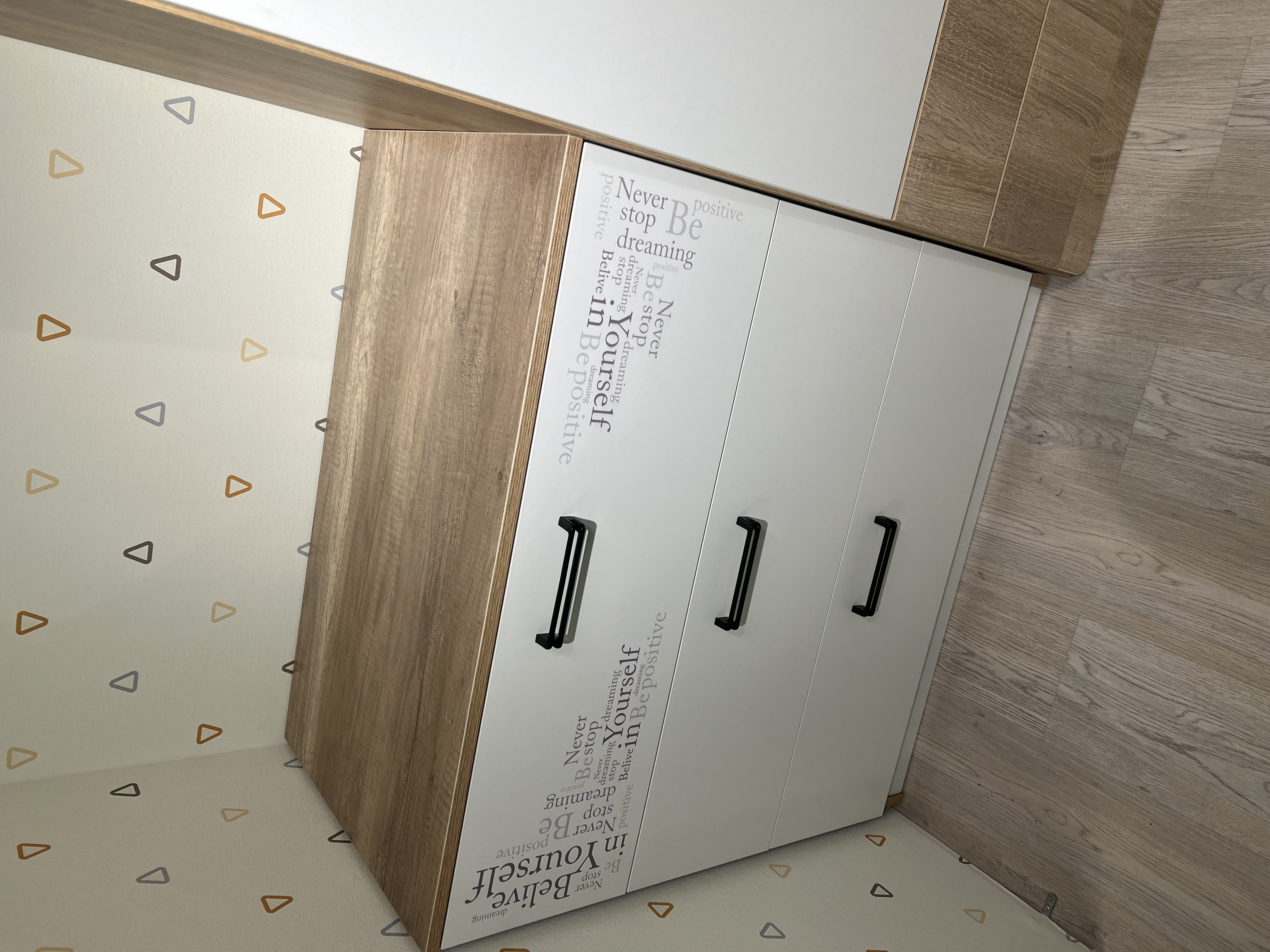 Мебель "Твой Стиль" выполнена из качественного, экологически чистого ЛДСП класса Е0,5 в сочетании цветов "дуб каньон + белый" и оформлена дизайнерским принтом.