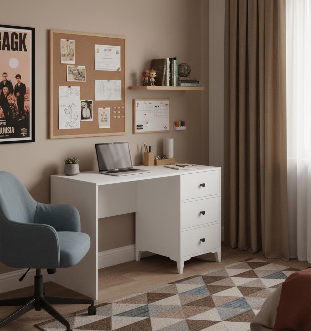 В стол встроены три выдвижных ящика на направляющих скрытого монтажа с доводчиками.