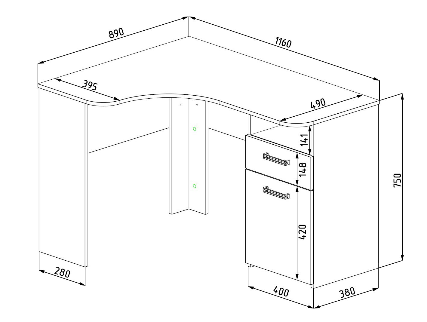Габариты стола: ширина 1160 х высота 750 х глубина 890 мм