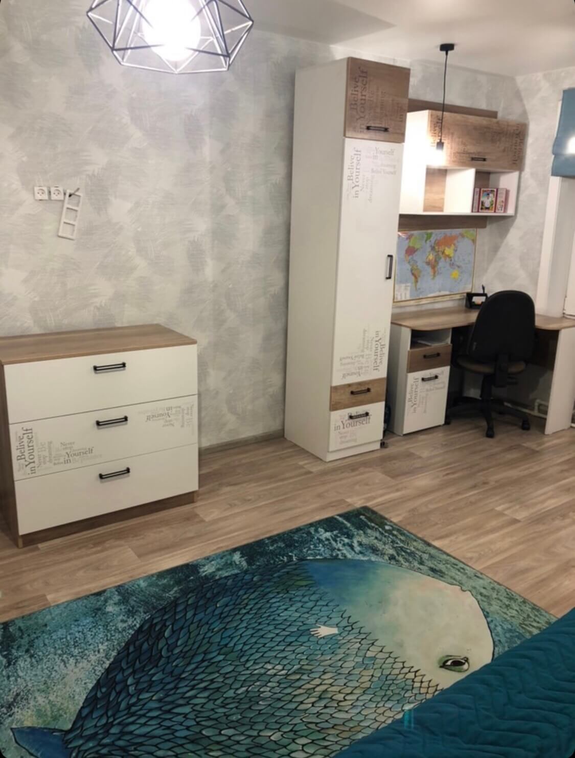 Мебель выполнена из сертифицированного, качественного, экологически чистого ЛДСП класса Е0,5 в сочетании цветов "дуб каньон + белый" и оформлена дизайнерским принтом.