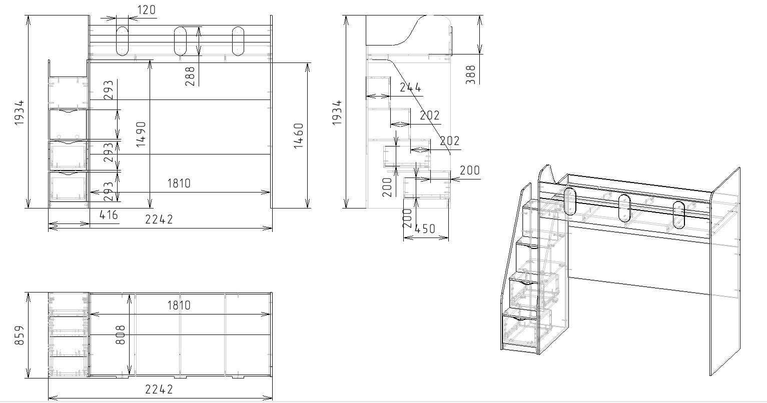 Габариты кровати: ширина с учетом лестницы 2242, глубина 859, высота 1934 мм