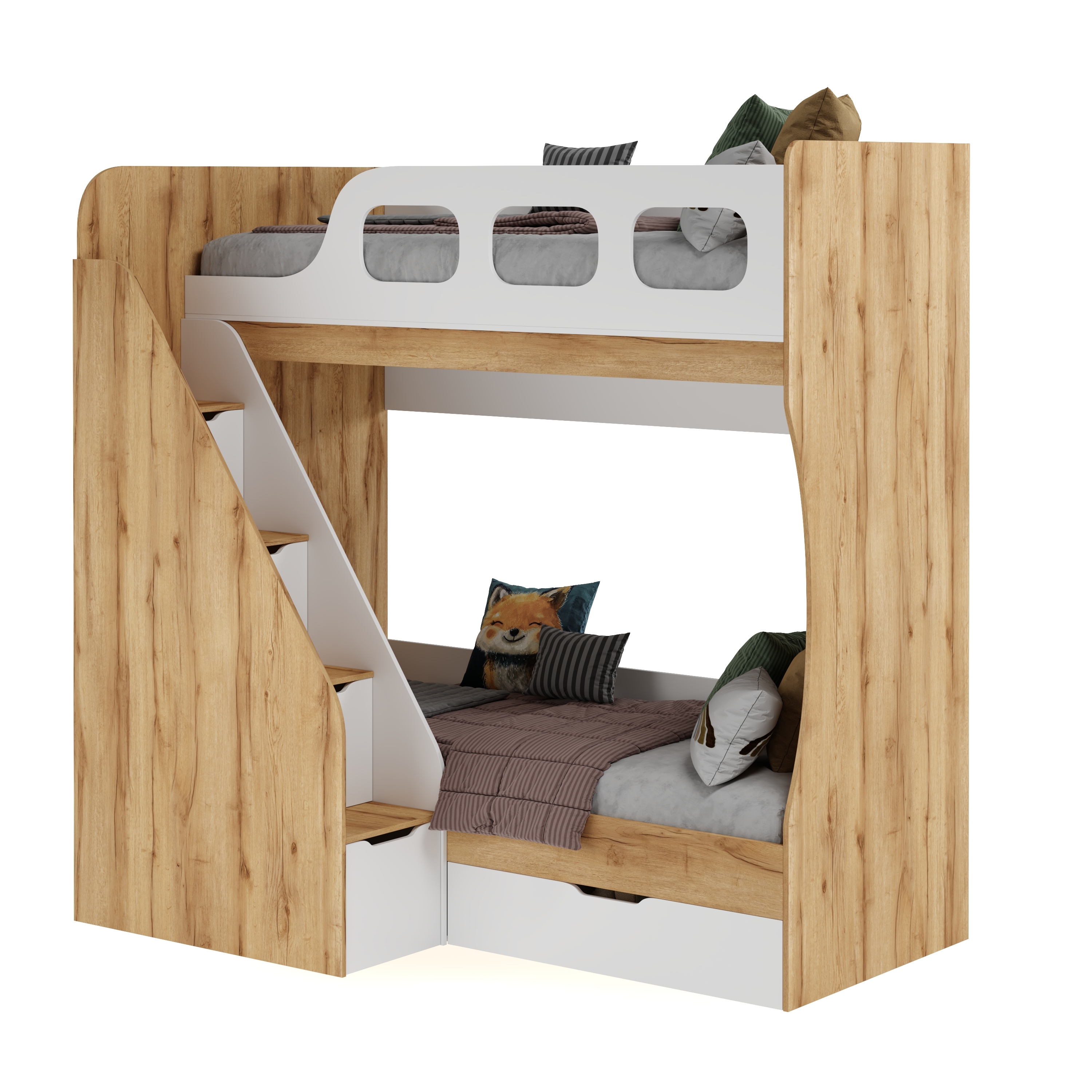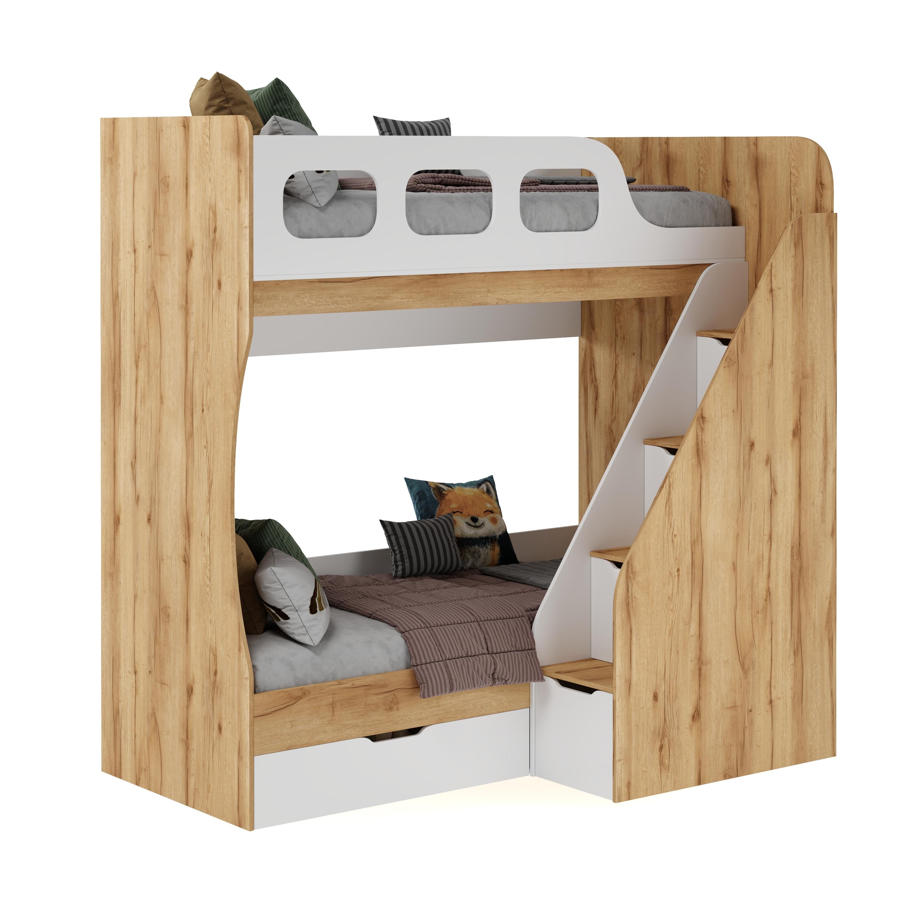 Высокая нагрузка на спальные места. Удобная лестница с ящиками. Высокий, безопасный бортк