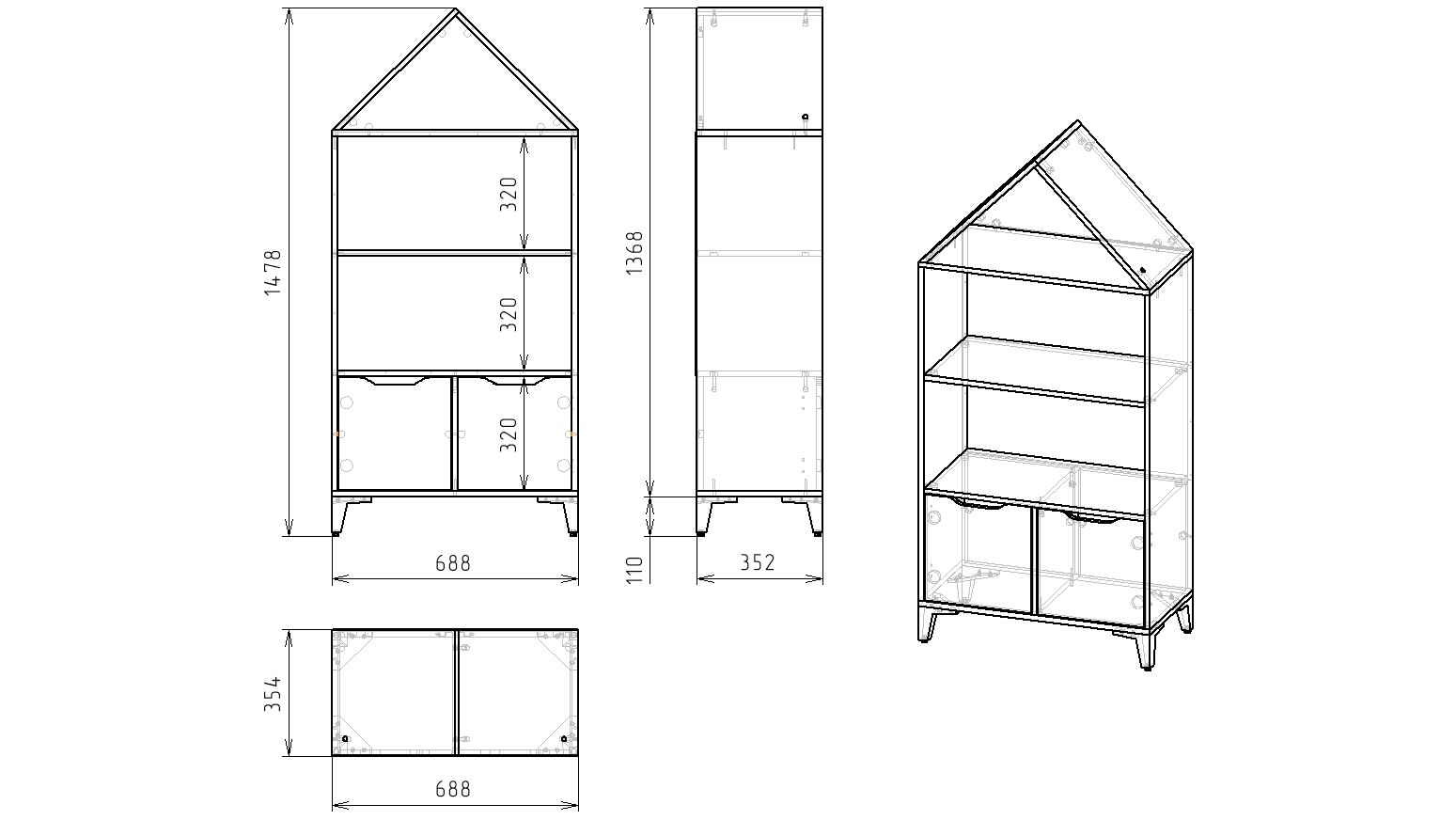 Габариты стеллажа: высота 1478, глубина 354, ширина 688 мм
