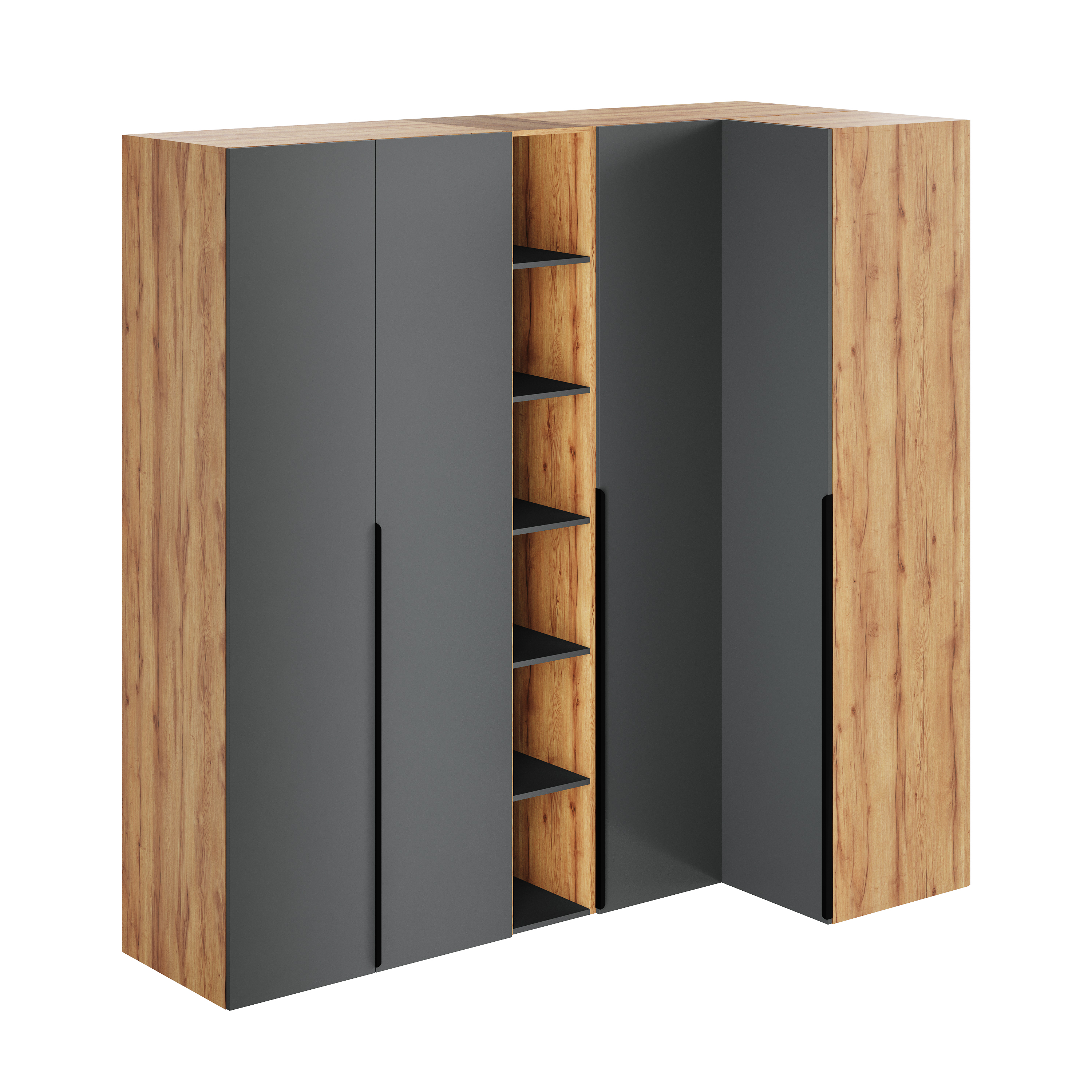 Распашной двухстворчатый шкаф + переходной стеллаж + угловой шкаф + пенал коллекции Брайт Графит