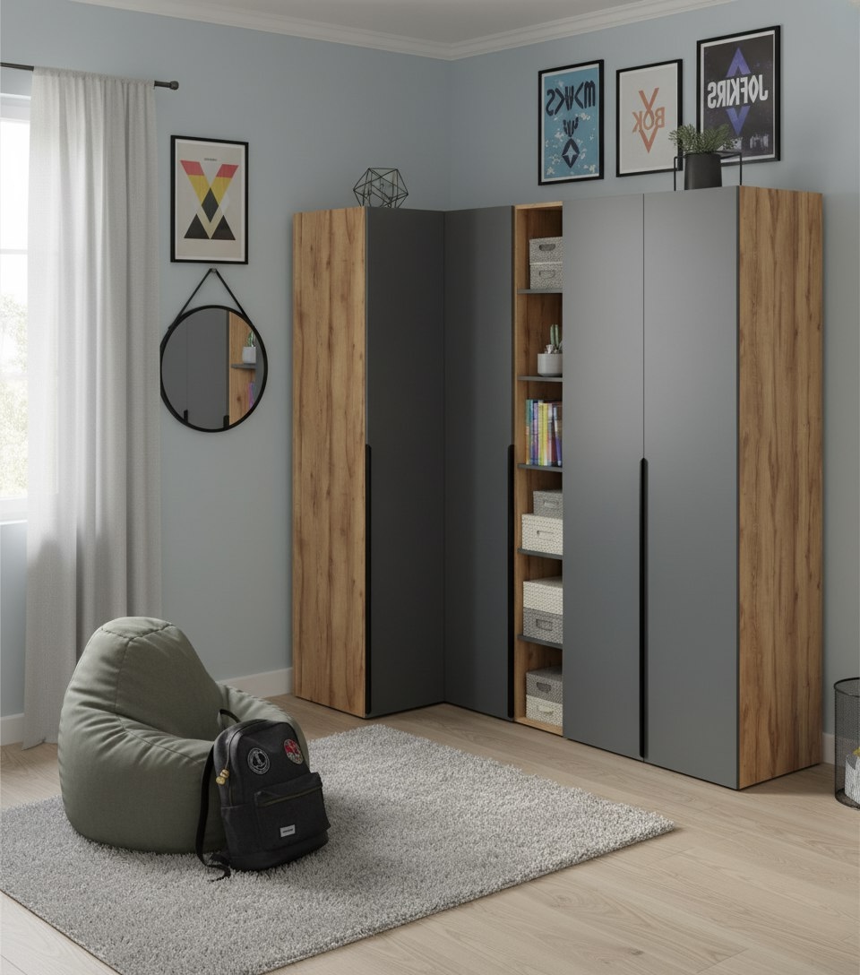 Распашной шкаф + стеллаж переходной + угловой шкаф + пенал коллекции Брайт Графит от Династия Kids