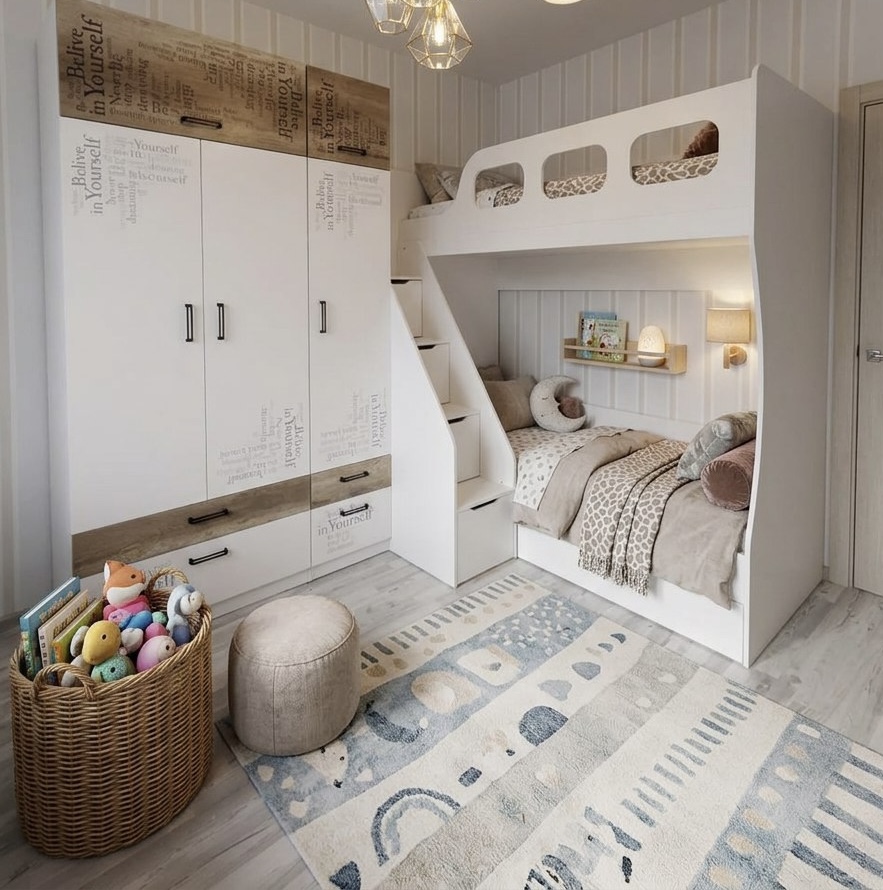 * В нижнюю кровать встроен выдвижной ящик для белья и игрушек.