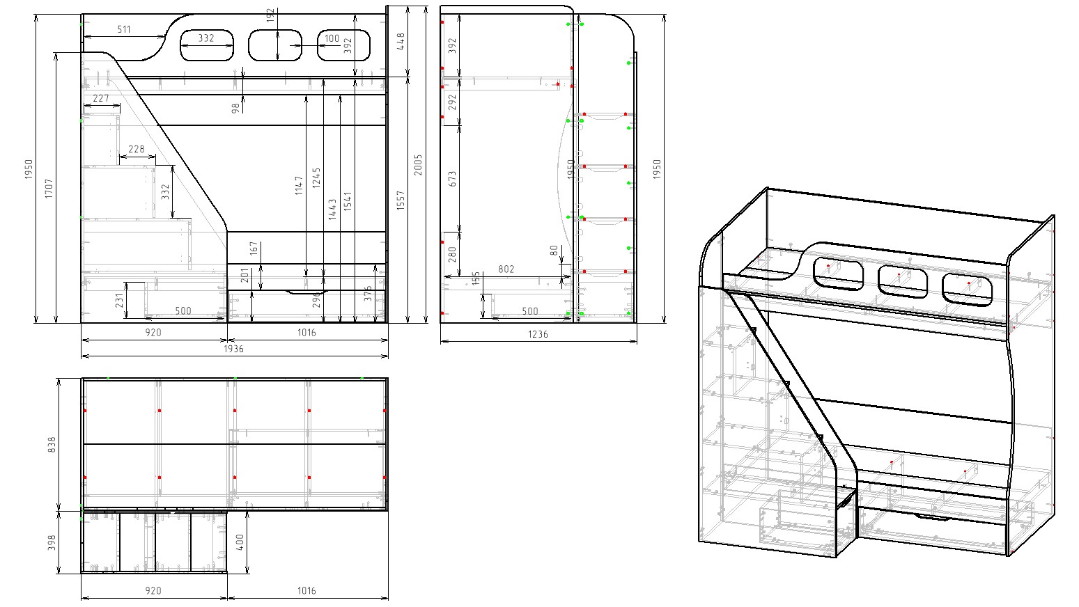 Габариты кровати: ширина 1936 х высота 1950 х глубина с учетом лестницы 1236 мм
