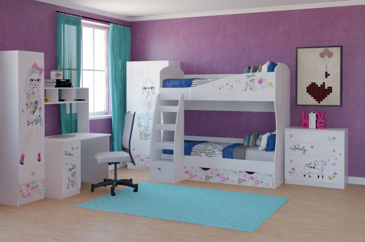 кровать 2-х ярусная + стол + шкаф + пенал + комод