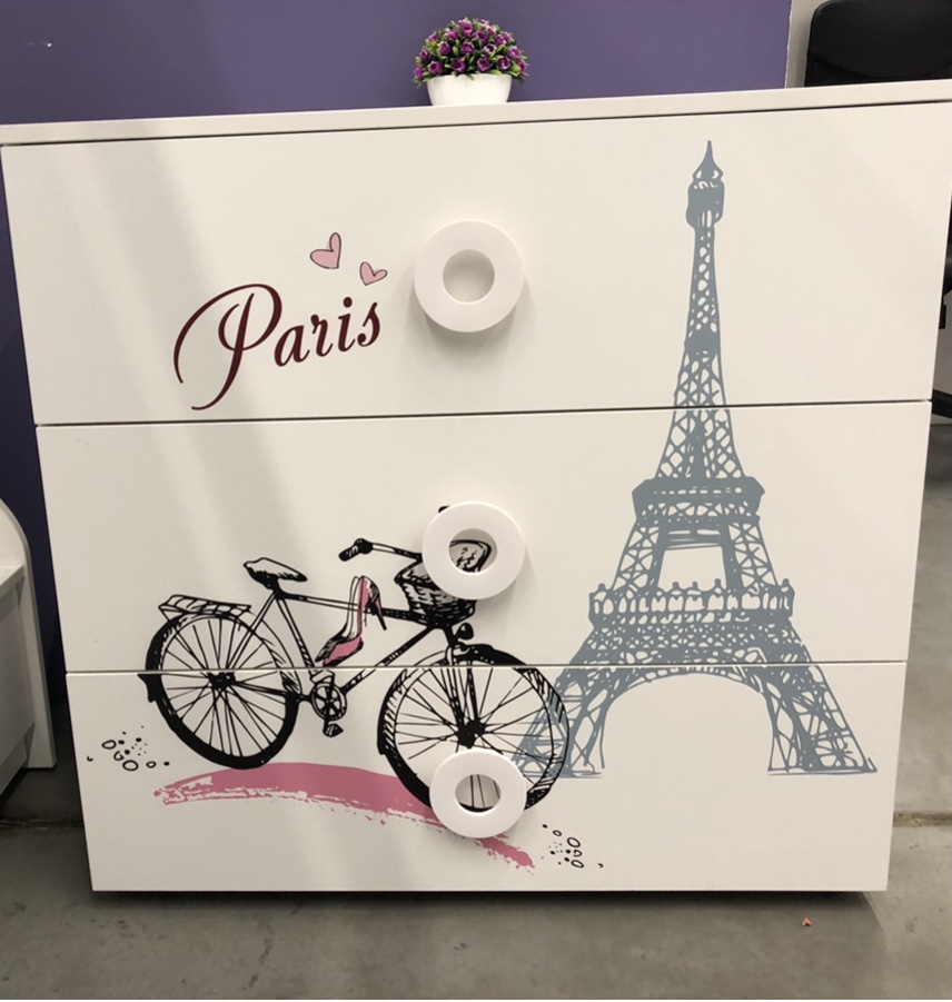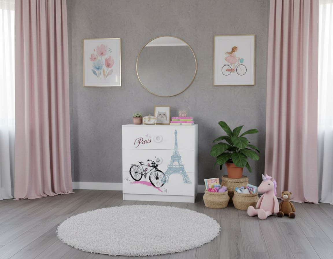 Комод выполнен из сертифицированного, качественного, экологически чистого ЛДСП е0,5 в белом цвете с дизайнерским принтом на фасадах.