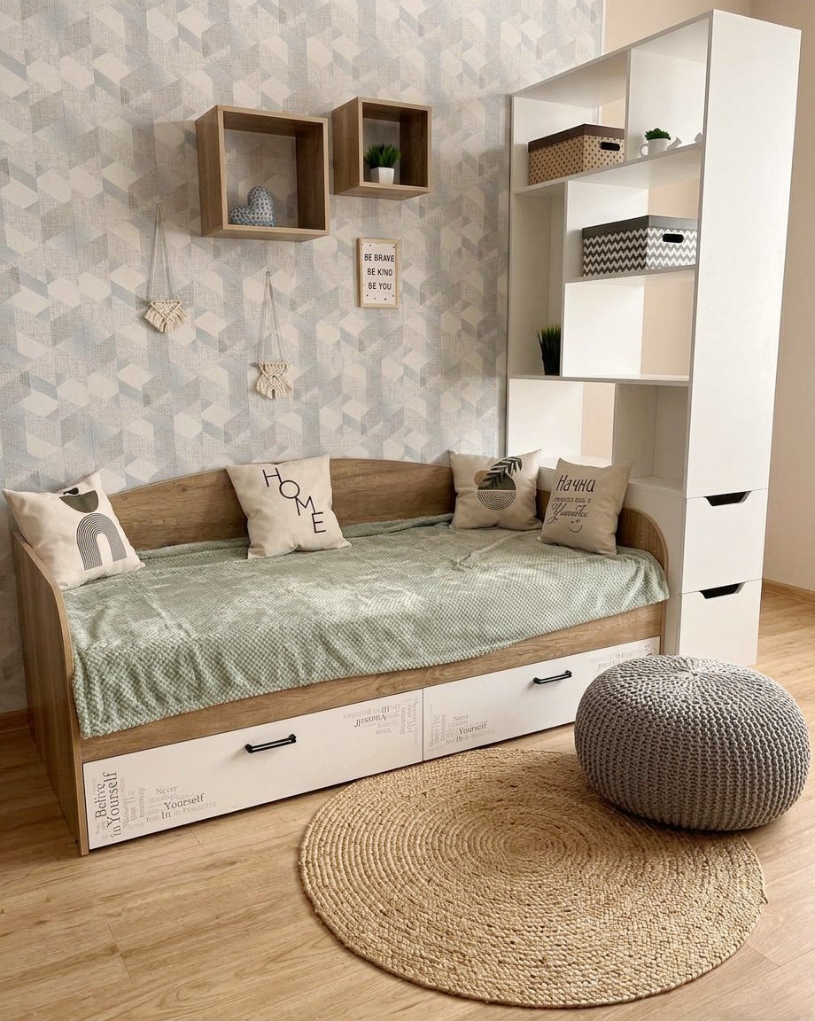 <comment>Просто шикарный стеллаж для создания зонирования! Подкупили сразу вместительные выдвижные ящики. Очень функционально. Кровать тоже отличная! Спасибо вам </comment>