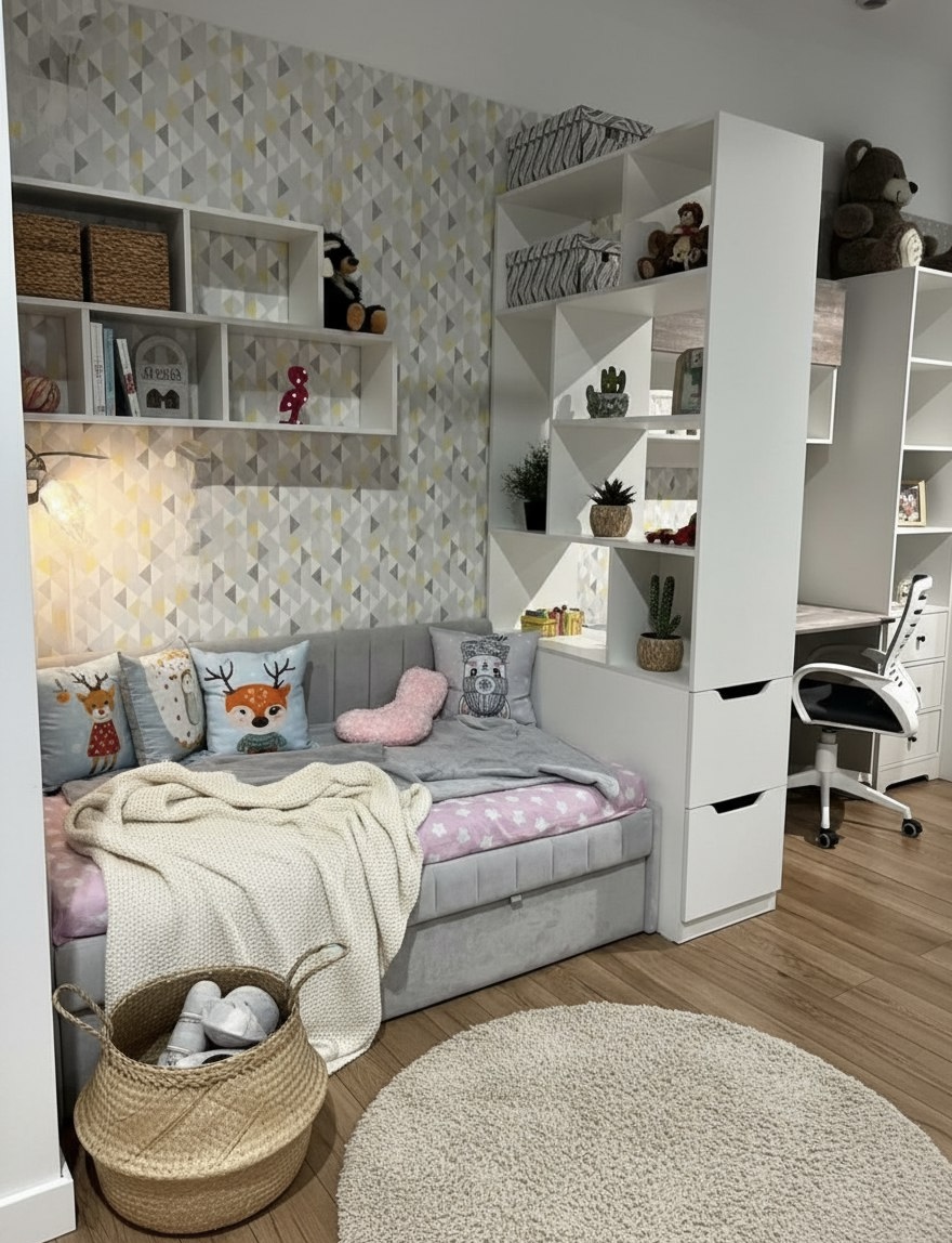 С помощью стеллажа можно разделить комнату на отдельные зоны: отдыха, учебы, встречи с друзьями, можно зонировать комнату для двоих детей.