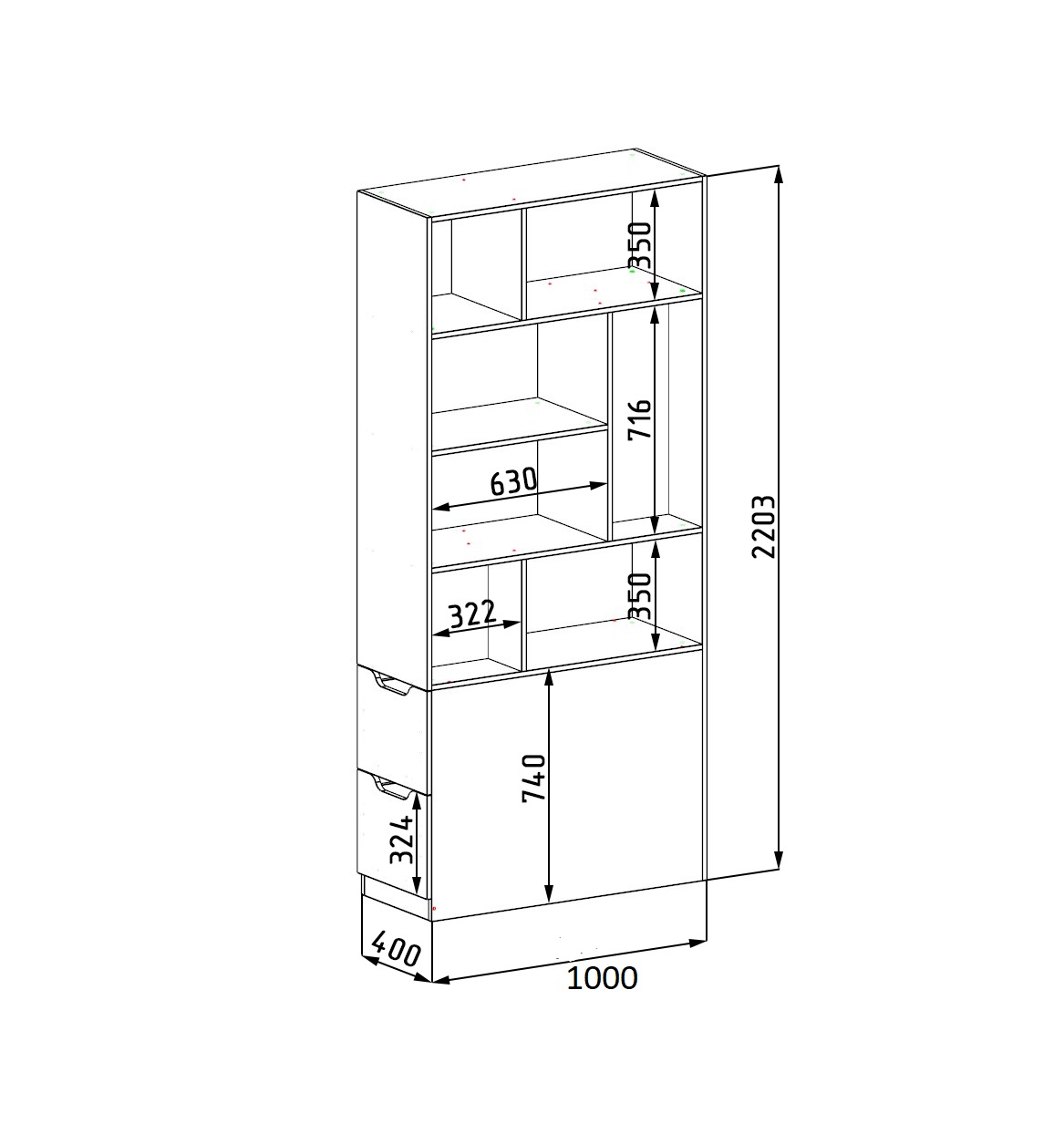Габариты стеллажа: высота 2203, глубина 400, ширина 1000 мм