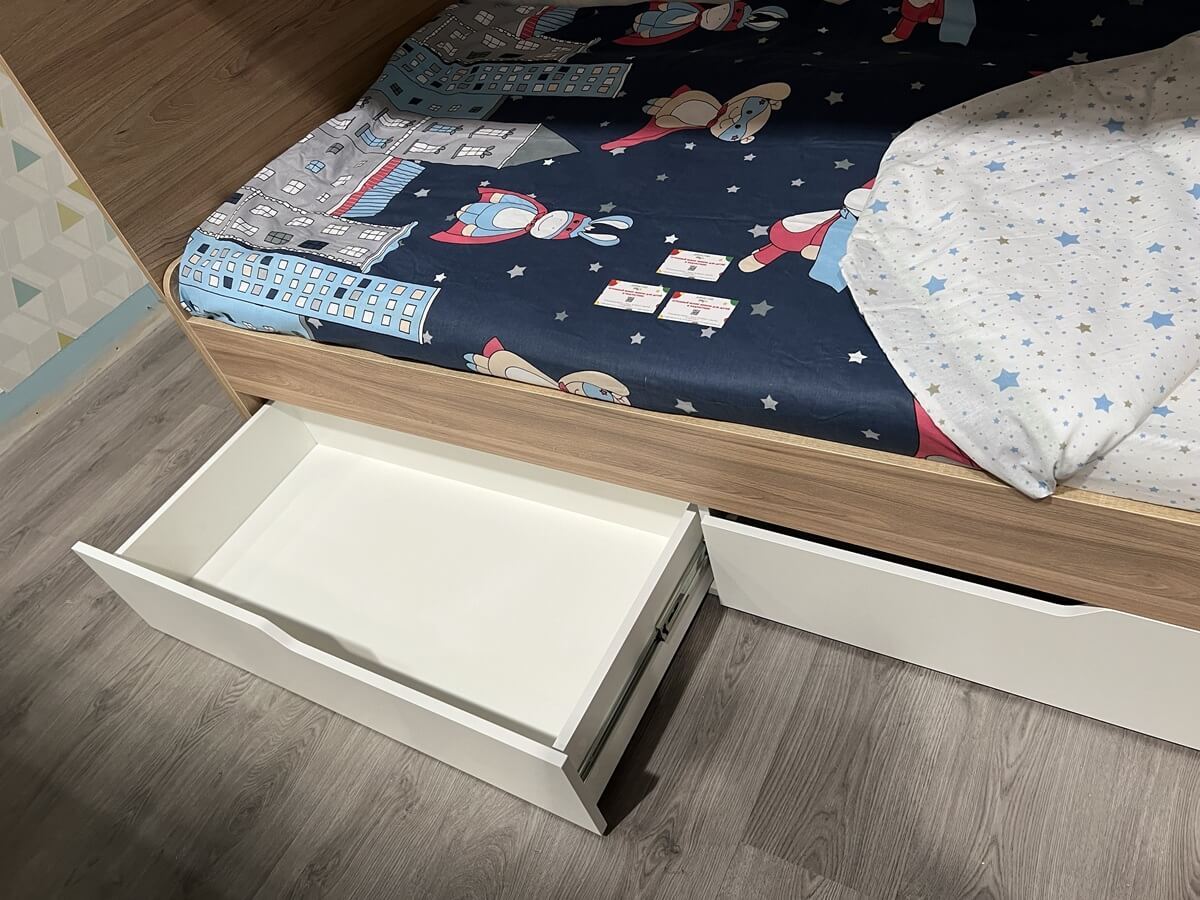 Вместо них - цельный и прочный настил из ЛДСП, который выдерживает сверхвысокую нагрузку и позволяет расположиться даже взрослому с ребенком.