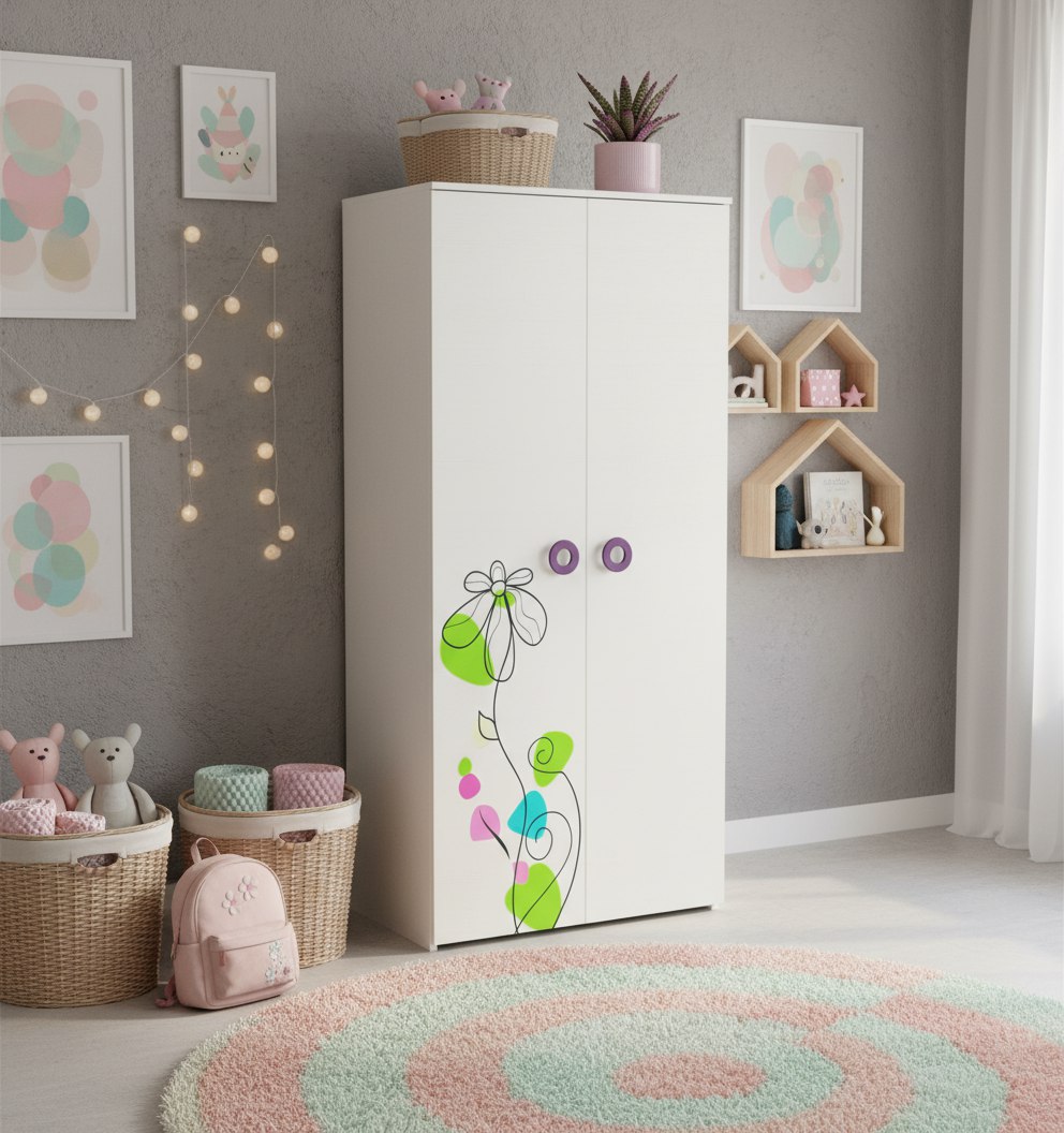 Шкаф коллекции "Цветы" выполнен из сертифицированного, качественного, экологически чистого ЛДСП класса Е0,5 в белом цвете.