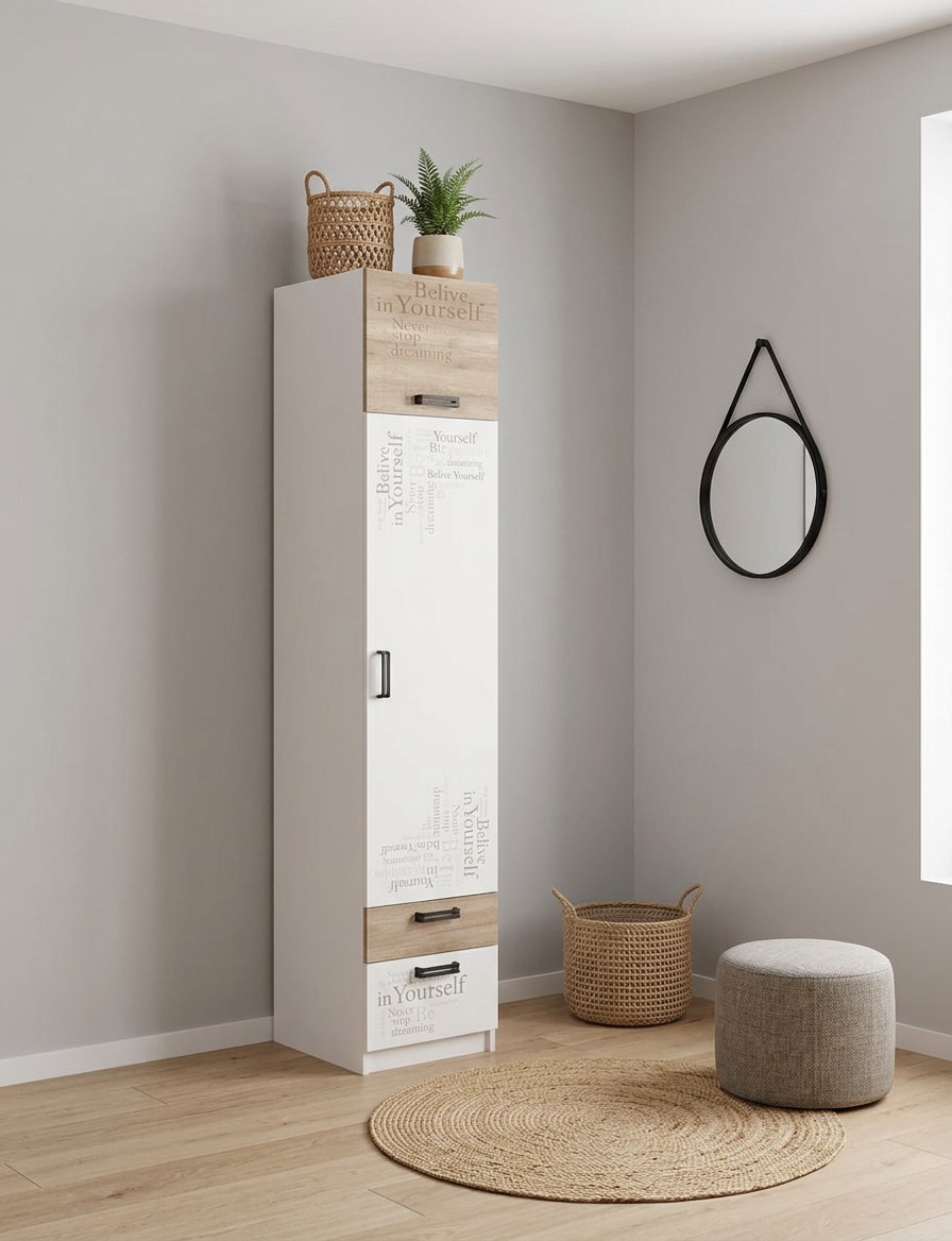 Мебель выполнена из сертифицированного, качественного, экологически чистого ЛДСП Е0,5 в сочетании цветов "дуб каньон + белый" и оформлена дизайнерским принтом.