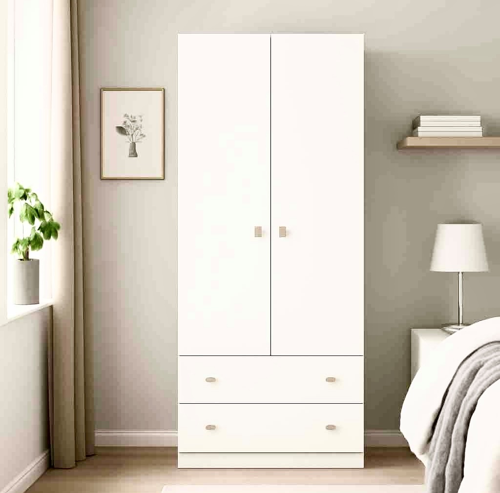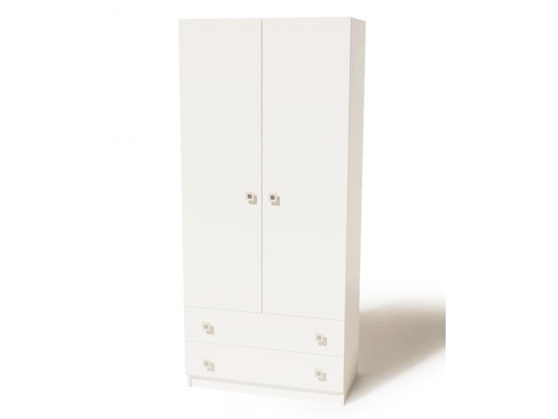 Шкаф оборудован двумя распашными дверями, двумя выдвижными ящиками для хранения мелких вещей.