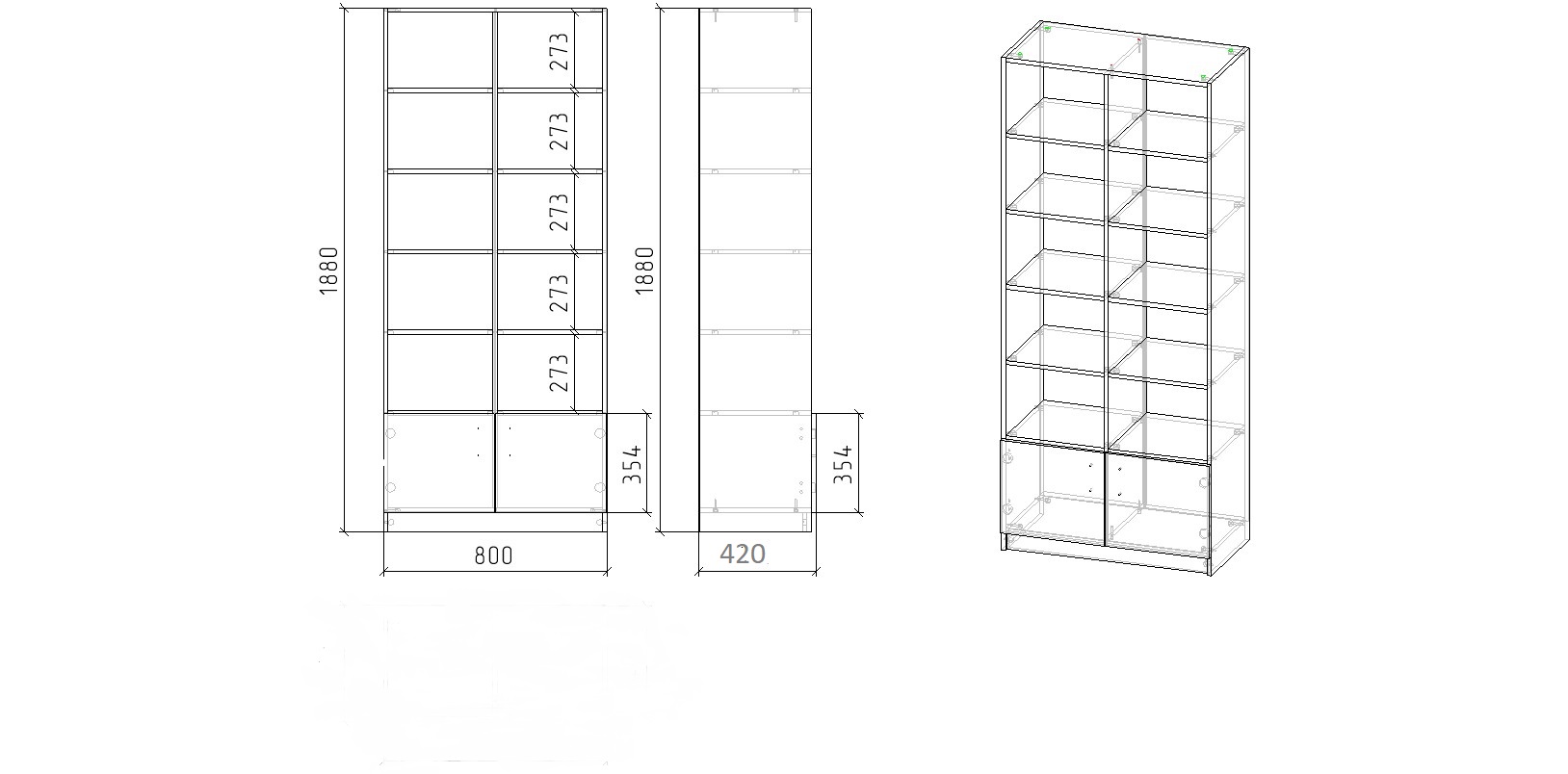 Габариты стеллажа: высота 1880 х ширина 800 х глубина 420