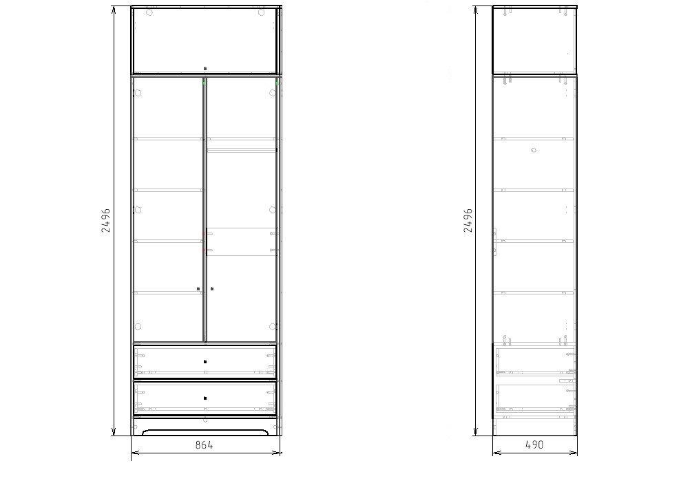 Габариты шкафа: ширина 864, глубина 490, высота 2496 мм