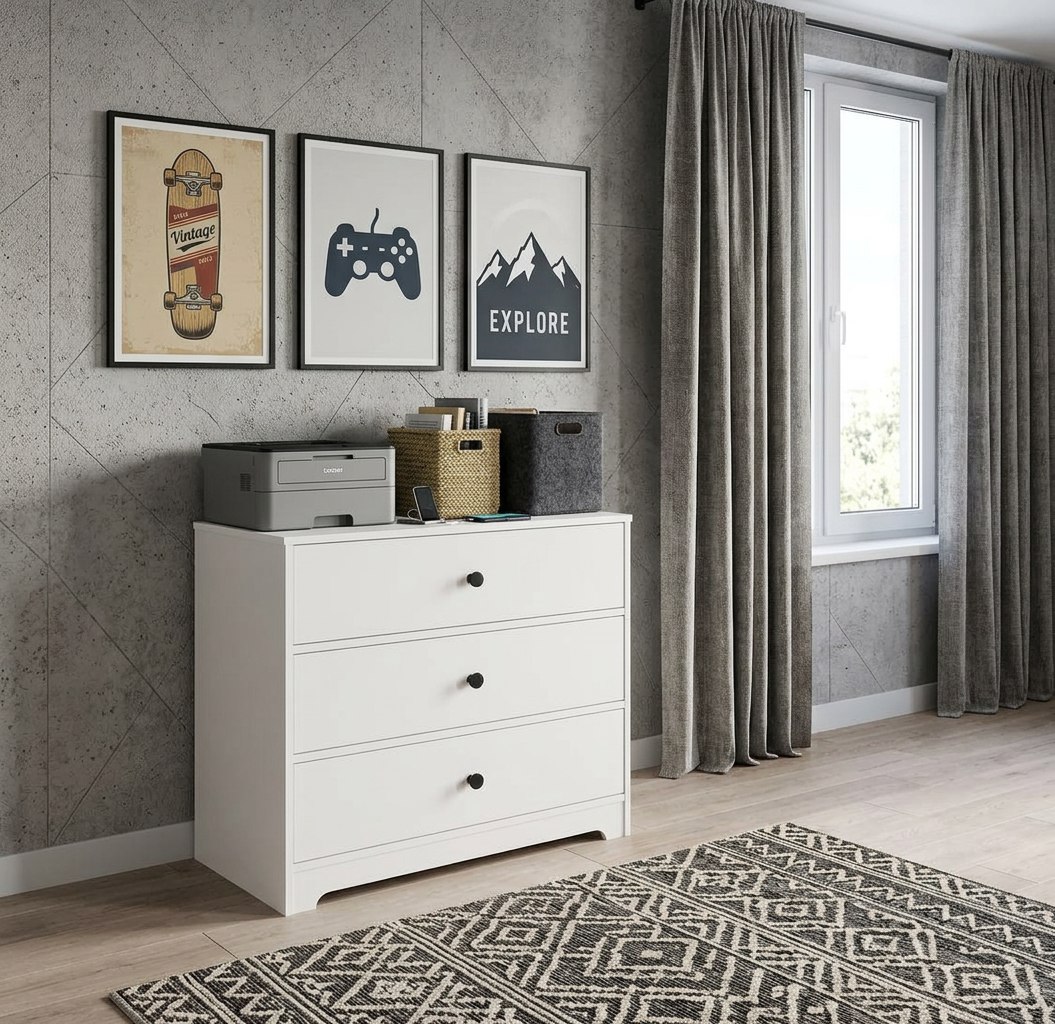 В комод встроены три выдвижных ящика на направляющих скрытого монтажа с ДОВОДЧИКАМИ.
