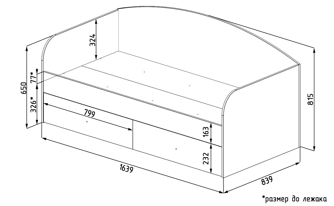 Габариты кровати: ширина 1636, высота 815, глубина 839 мм