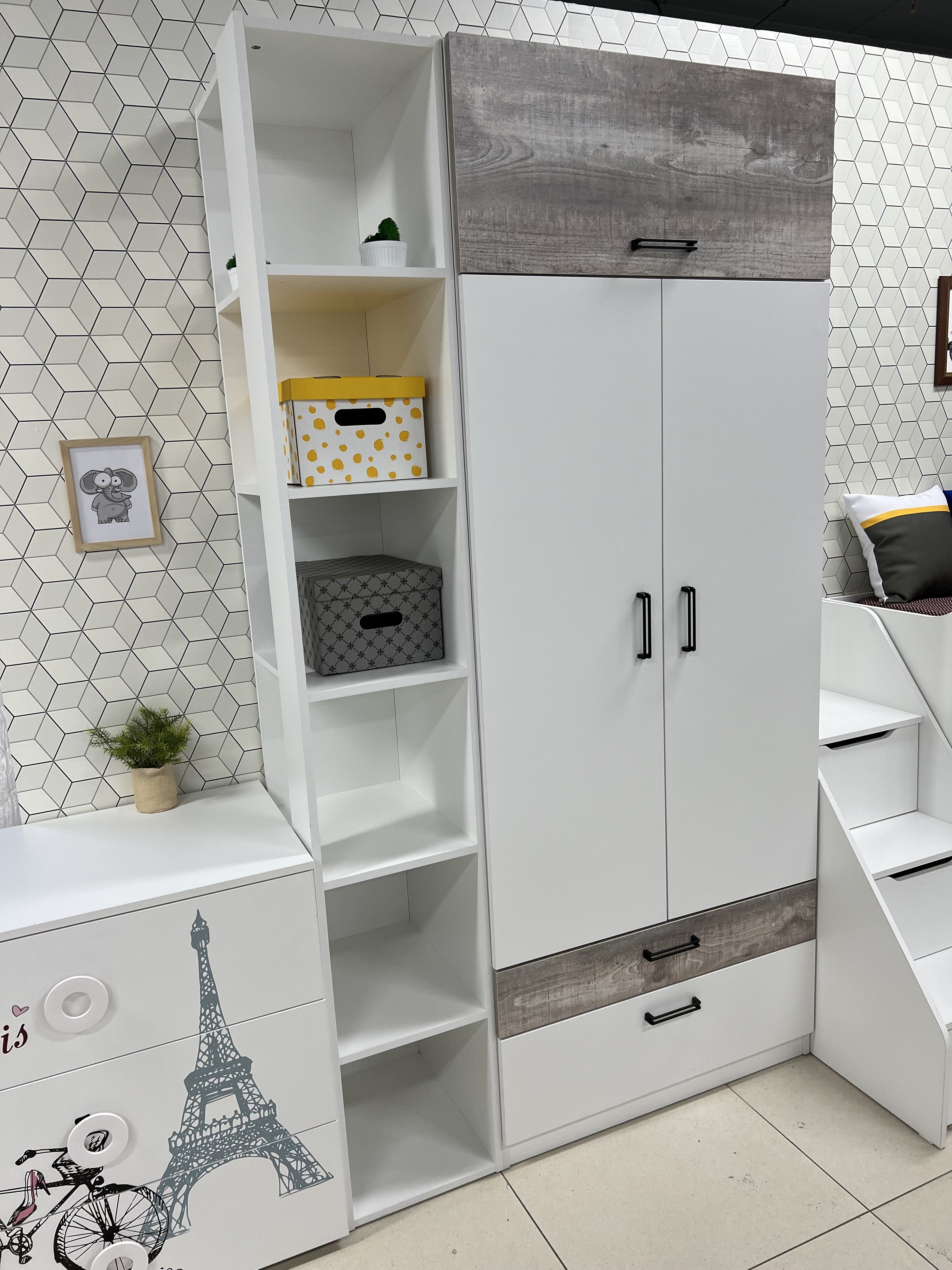 Мебель выполнена из сертифицированного, качественного, экологически чистого ЛДСП класса Е0,5 в сочетании цветов "бетон пайн" + белый.