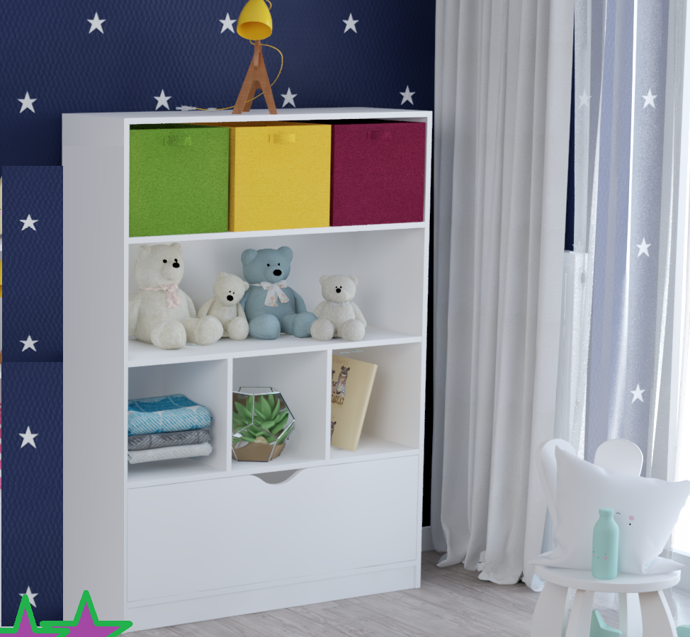 Вместительный стеллаж - практичное дополнение в интерьере детской комнаты.