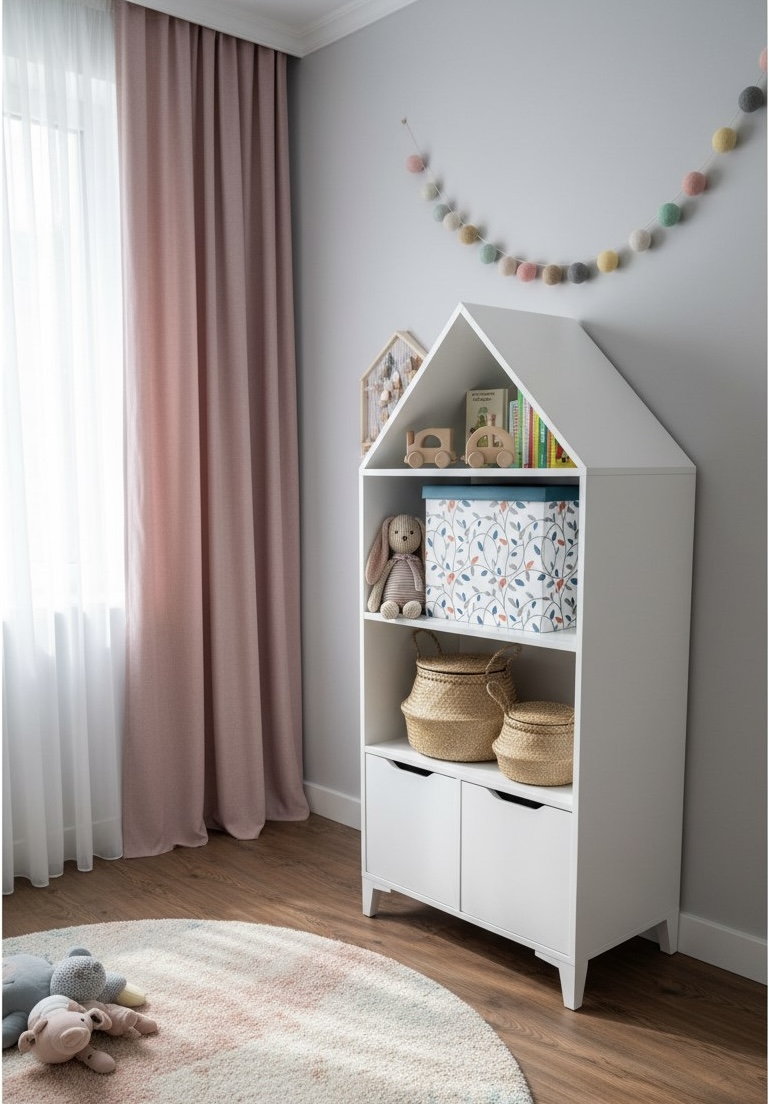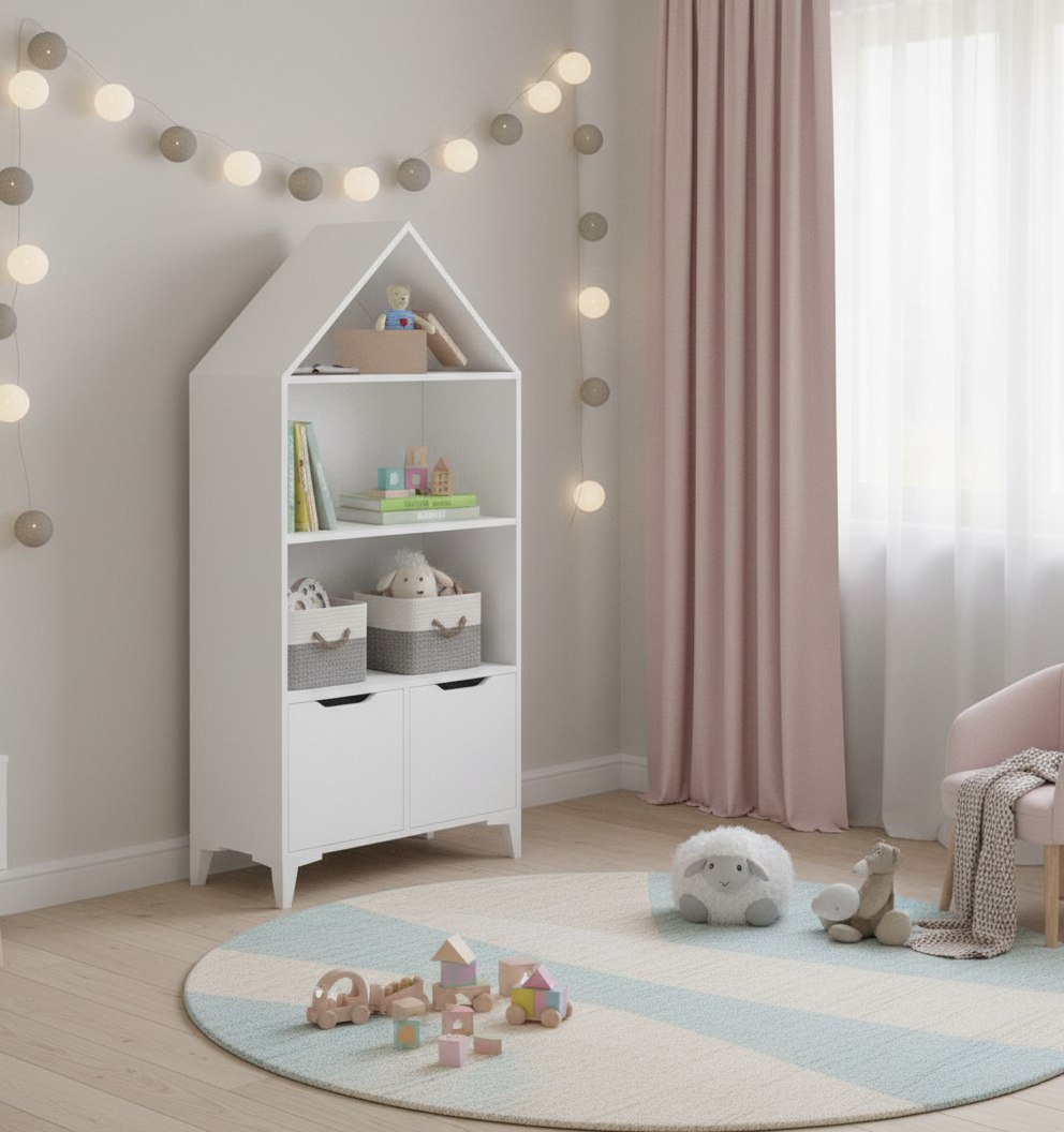 Стеллаж в виде домика - оригинальное и практичное дополнение в интерьере детской комнаты.